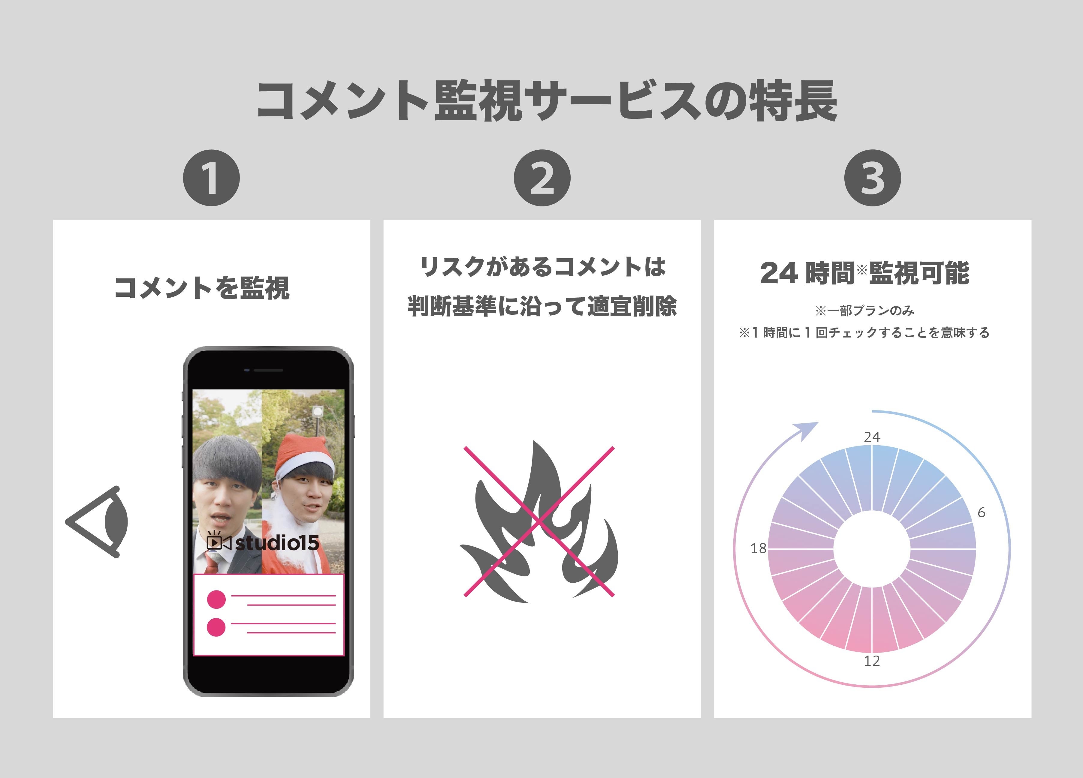 3.24時間監視可能:最上位プランであれば1時間に1回という頻度で監視を実施し、アカウントや投稿動画を健全な状態に保つことができます。目視確認および非表示対応の監視頻度は6時間毎、1時間毎、1時間毎の3つのプランからお選びいただけます。