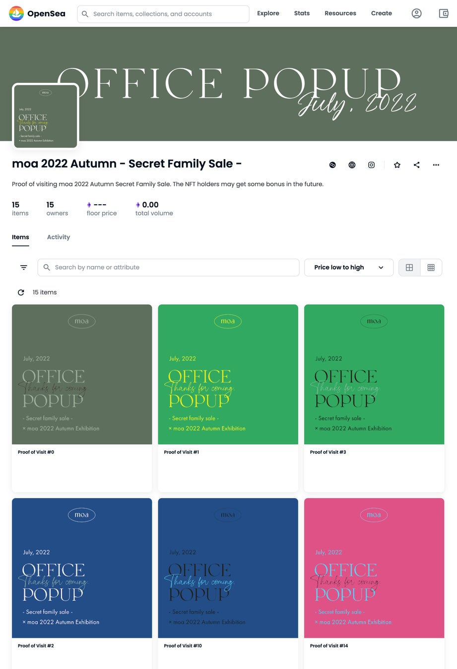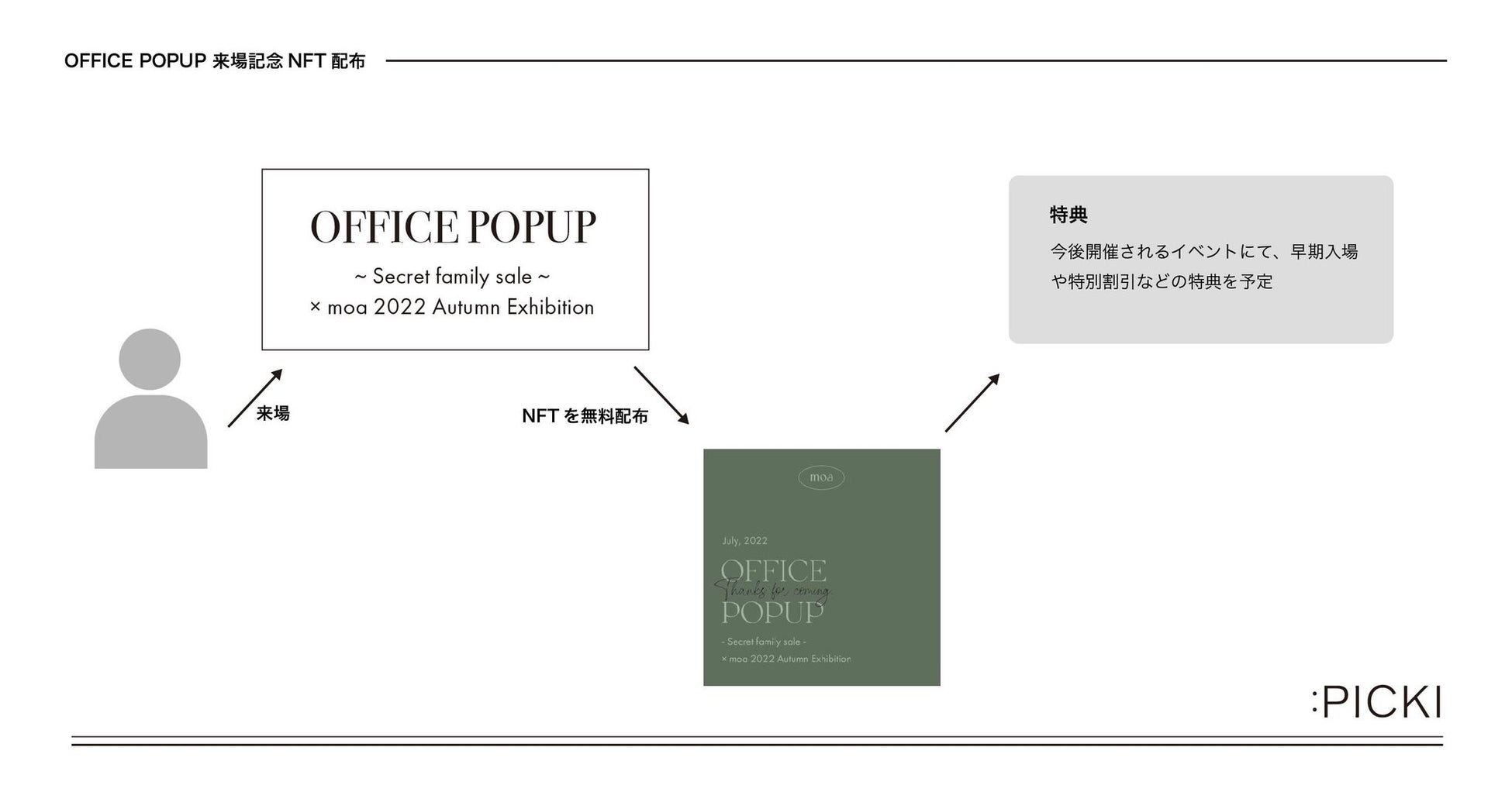 今回のオフィスPOPUPでは、NFTやブロックチェーン上の技術を活用したビジネスが世界的に注目される中、「アパレル×NFT事業」の一貫としてNFTの無料配布を実施しました。NFTの保有者には、今後開催されるイベントで、先行入場などの特別特典が付与される予定です。