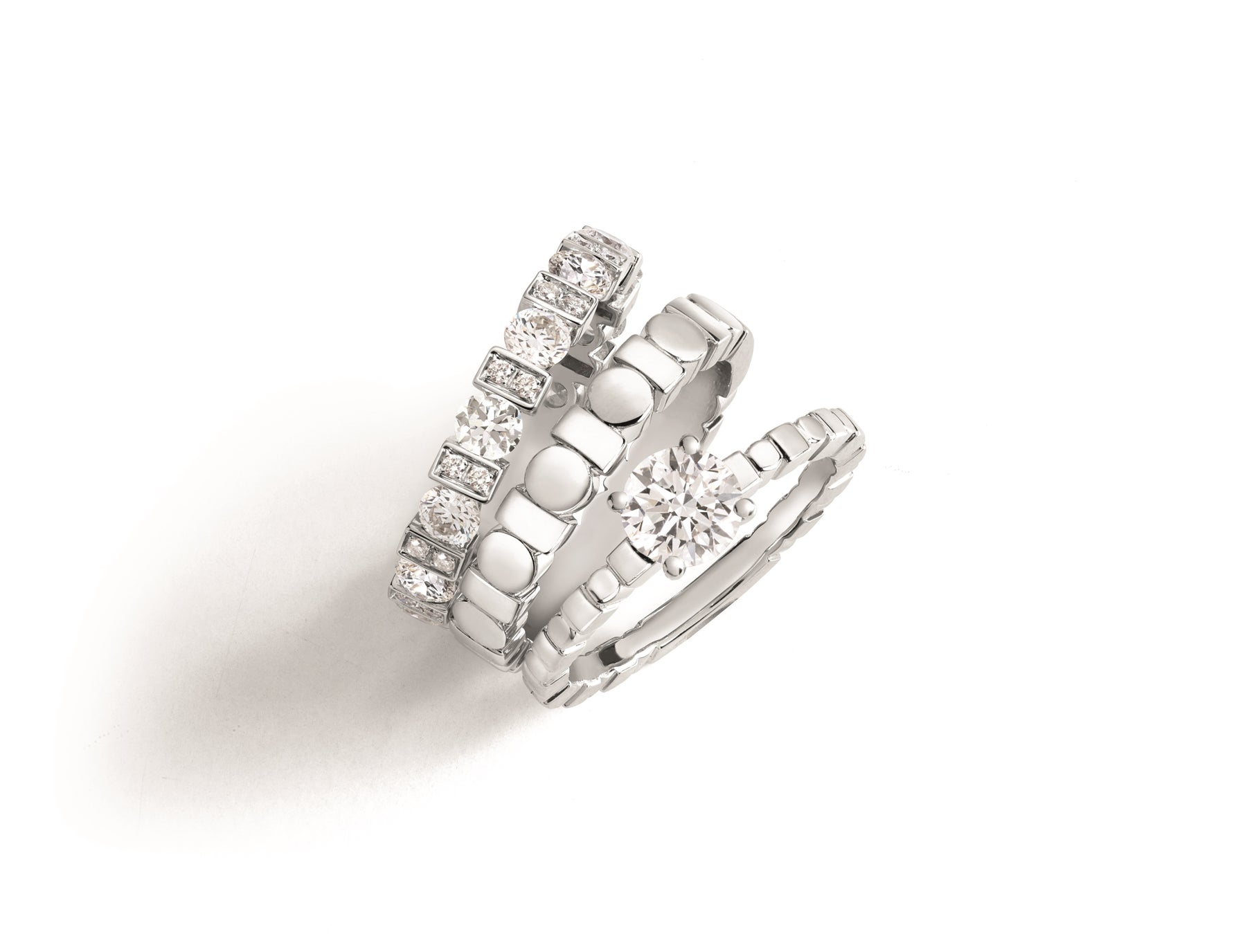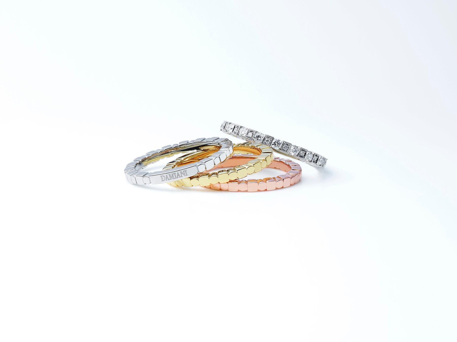ダミアーニのアイコンとなるコレクション、「ベル エポック」の ブライダルラインは、マリッジリング、エタニティリング、エンゲージメントリングがスタッカブル(重ねづけ可能)なデザインで登場します。プラチナのエンゲージメントリングに合わせるマリッジリングは、プラチナ・イエローゴールド・ピンクゴールドの3色(2mm・2.7mm幅のバリエーション)、ダイヤモンドエタニティリング(2mm・2.7mm・3.5mm)も揃います。