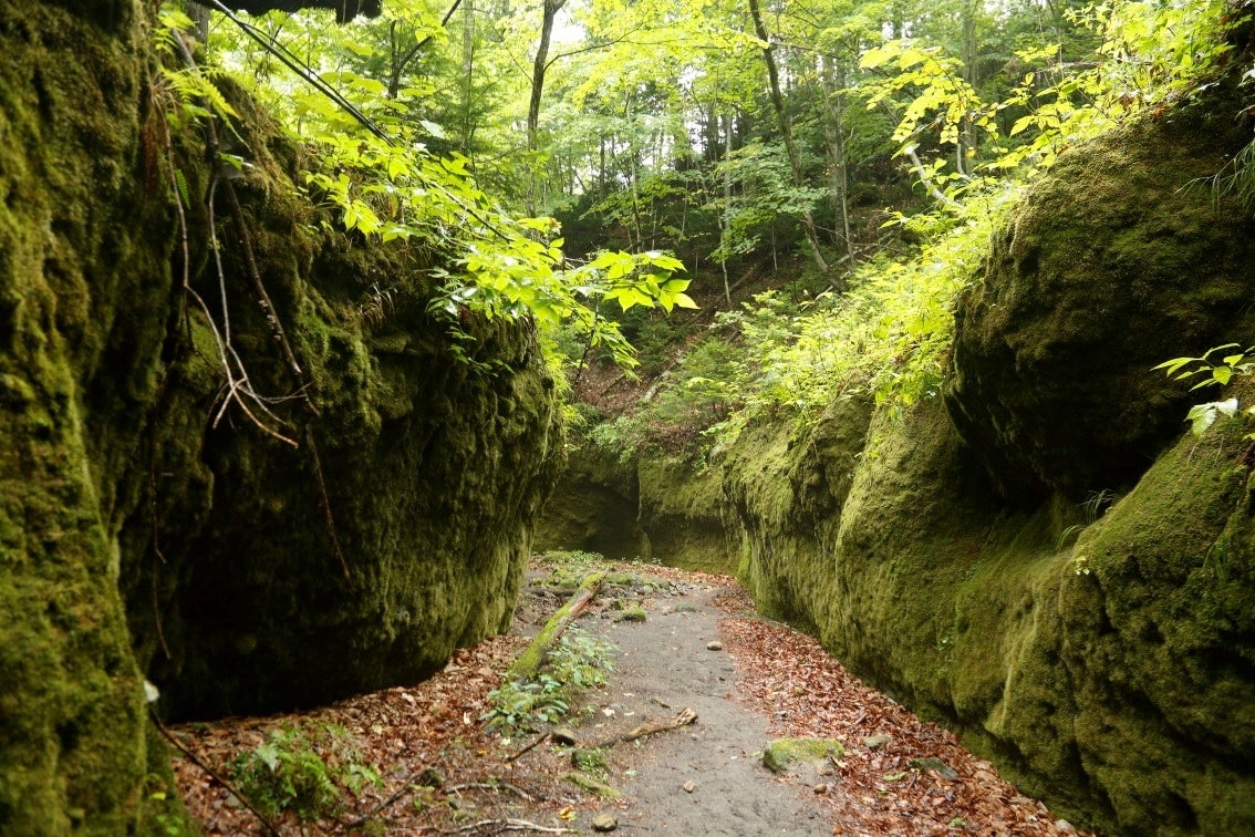 「苔の回廊」は北海道支笏洞爺国立公園内、樽前山北西側の麓、支笏湖南西の場所に位置し、火山活動とともに長い年月をかけて形成され、高さは3~10メートルほどの壁一面に苔が覆われた数百メートルにもわたる回廊で、緑色の濃いものやふわふわした種類など様々な苔が自生する異世界空間です。