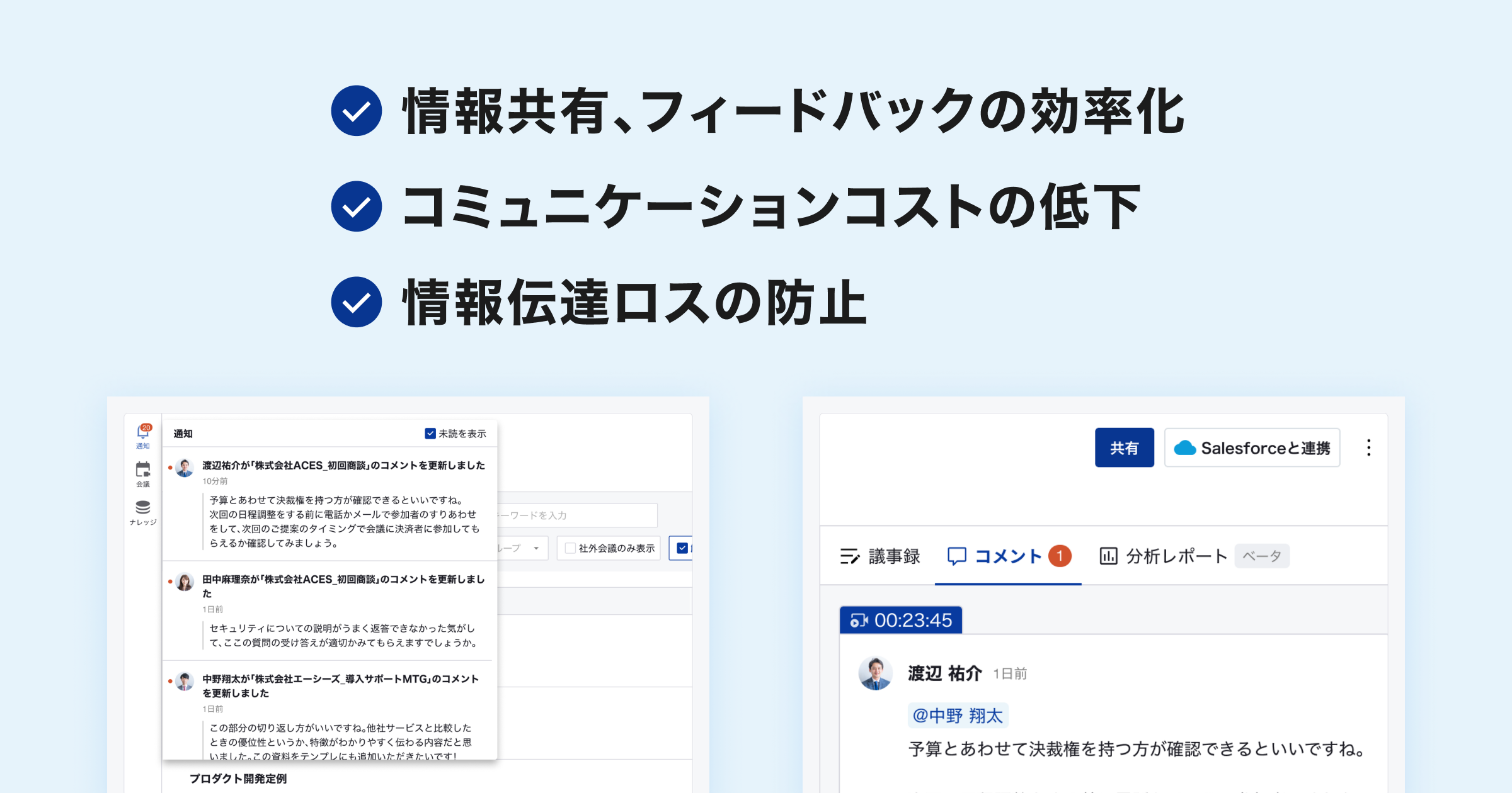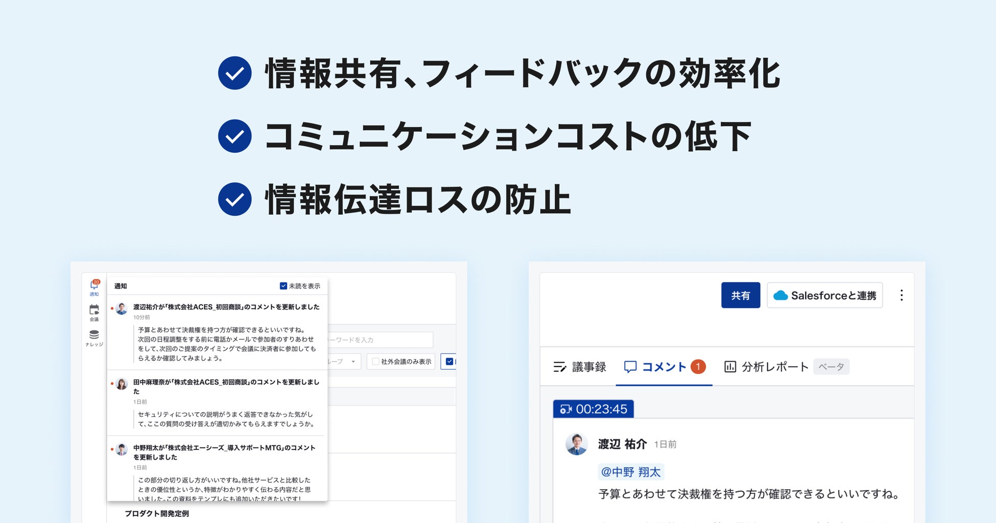 ACESは、ACES Meetを用いたセールスイネーブルメントをより後押しすべく、「ACES Meet」においてコメント通知機能を搭載いたしました。コメント通知機能により、会議体への参加者・非参加者への情報共有、フィードバックをよりスムーズに行うことが可能になりコミュニケーションコストの低下、情報伝達ロスの防止にお使いいただけます。