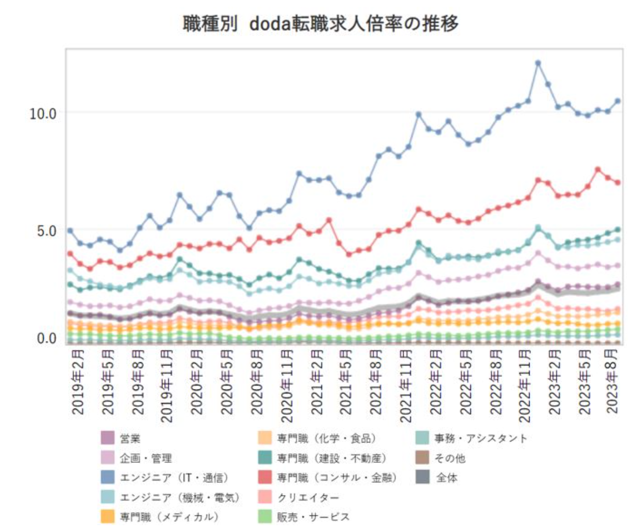 dodaが2023年9月21日に発表した転職求人倍率レポートによると、エンジニア(IT・通信)の転職求人倍率は、他の職種と大きな差をつけ「10.46倍」と、唯一の10倍超えになっています。(2023年8月時点)