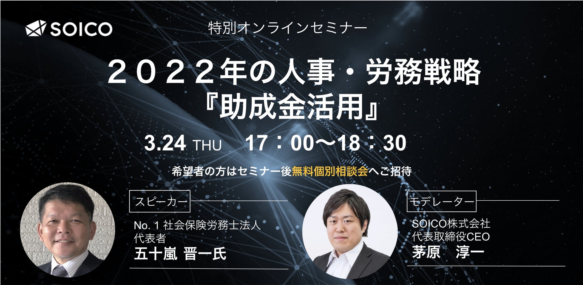 SOICO株式会社(本社:東京都港区、代表取締役CEO:茅原淳一、以下「SOICO」)は、No.1社会保険労務士法人(本社:東京都、代表者:五十嵐晋一)との特別共同セミナー『スタートアップ必見!2022最新の助成金活用法!』を2022年3月24日(木)に開催します。
