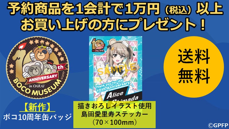 【予約商品を1会計10,000円(税込)以上ご注文頂いた方に、「島田愛里寿ステッカー」「新作ボコミュージアム10周年缶バッジ」プレゼント&送料無料!】