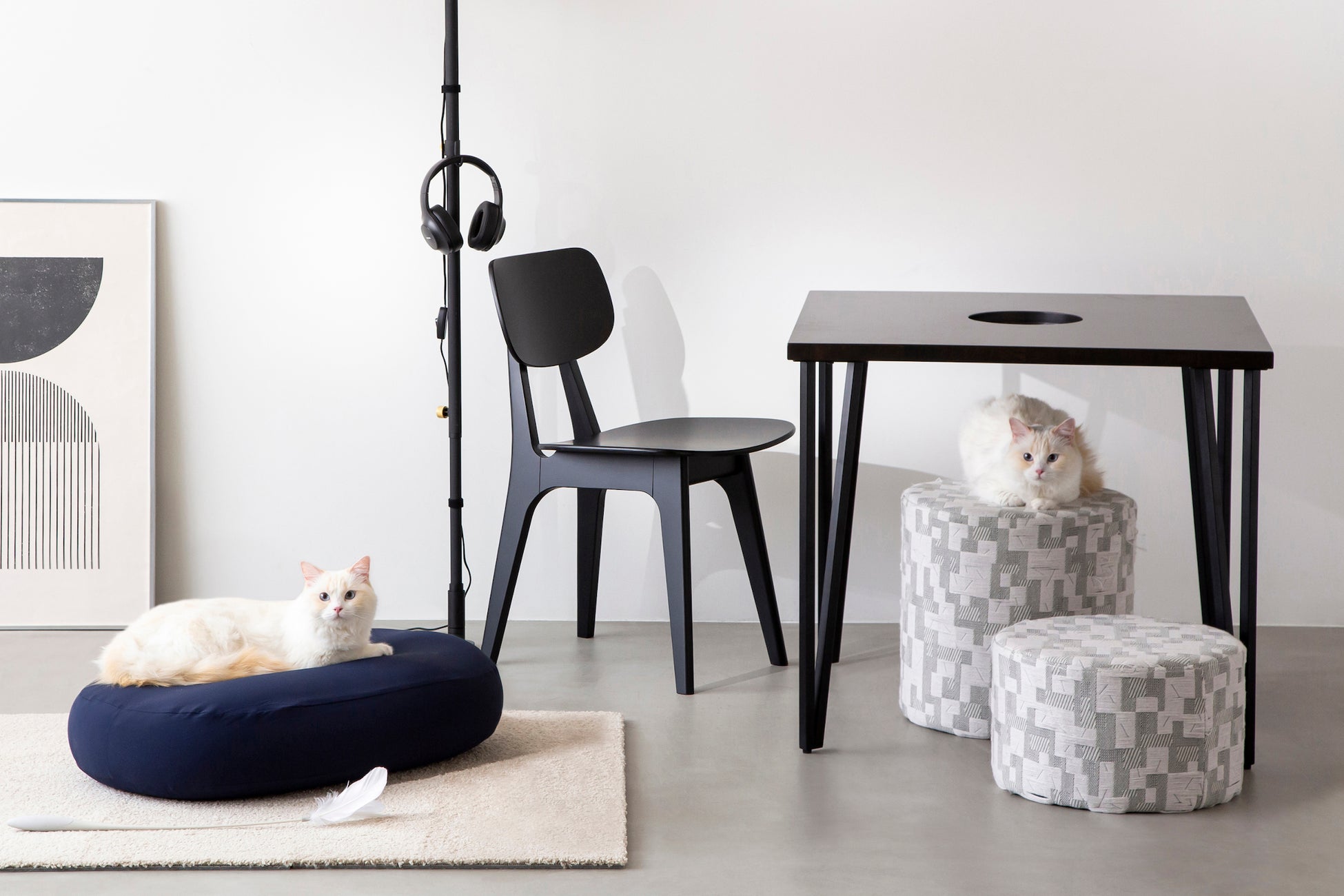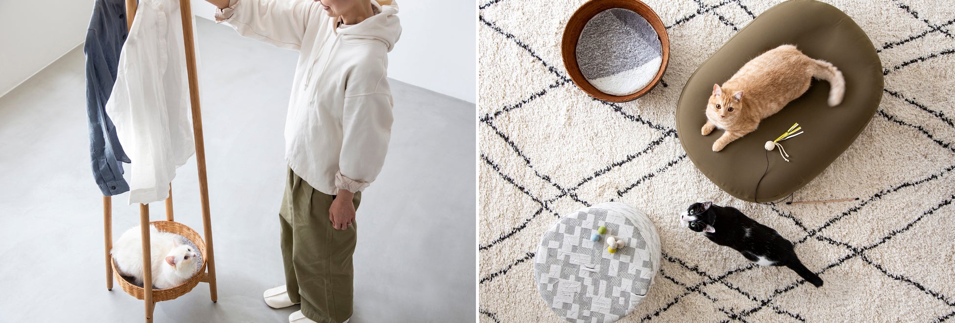 猫と飼い主がともにゆったりとした時間を過ごせる爪が引っかかりにくい仕様のビーズクッションや、猫と一緒に使えるバスケットなど、ミニマルでシンプルなデザインだけでなく、機能性にも優れたアイテムをセレクトしました。