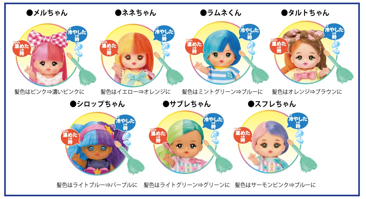 従来のメルちゃんシリーズ同様に、パイロットコーポレーション独自のメタモヘアを使用しており、氷水(15℃以下)で髪の毛の色が変化します。髪の毛全体の色を変えたり、一部だけ模様をつけたりオリジナルのヘアアレンジが楽しめます。部屋の中やお風呂ではもちろん、ポケットやバッグ、チャームに入れて、お外に連れて行って一緒に遊ぶことも出来ます。