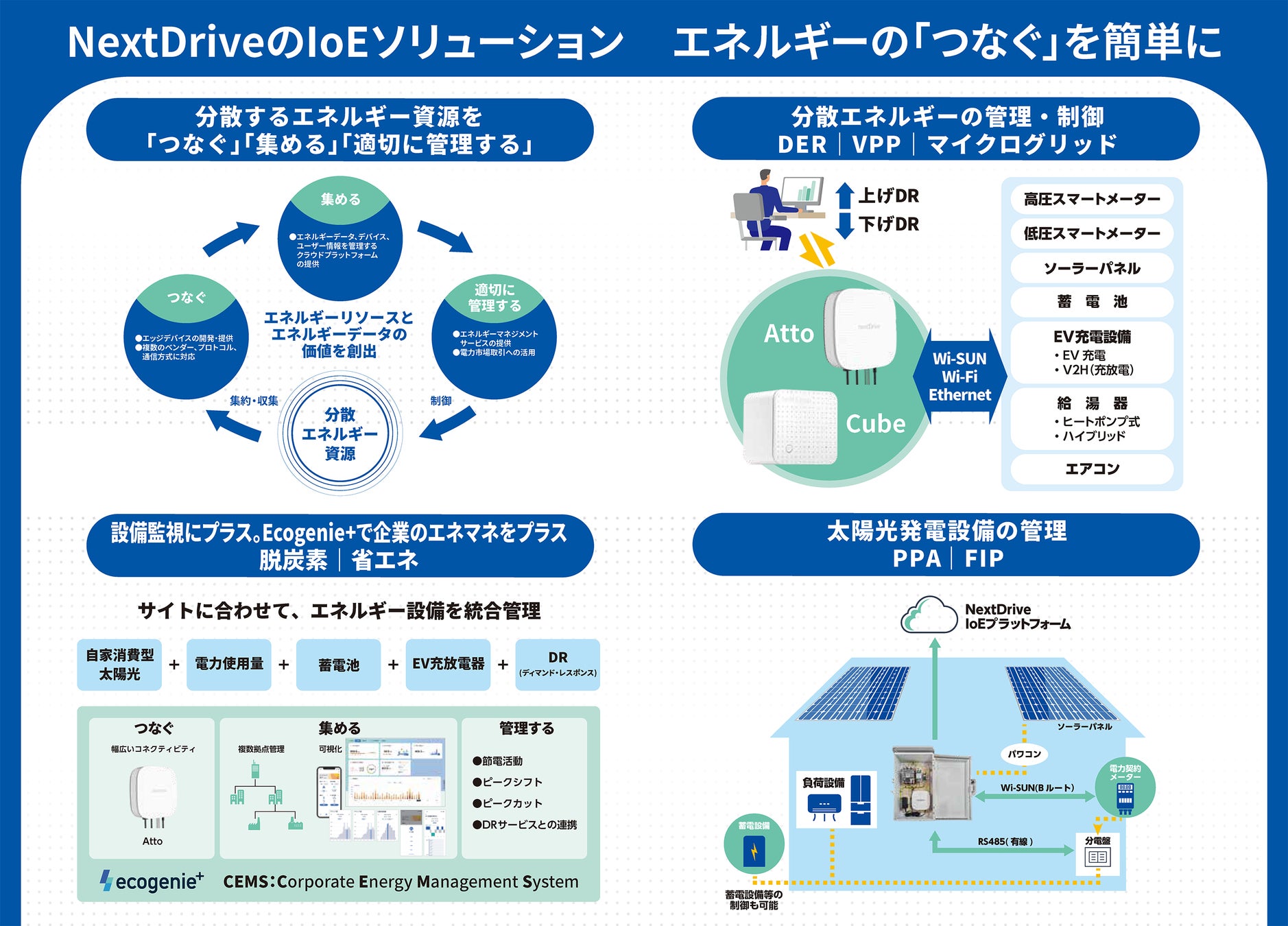 NextDriveのIoEプラットフォームは、分散するエネルギー設備のネットワーク化を素早く、手軽に実現します。