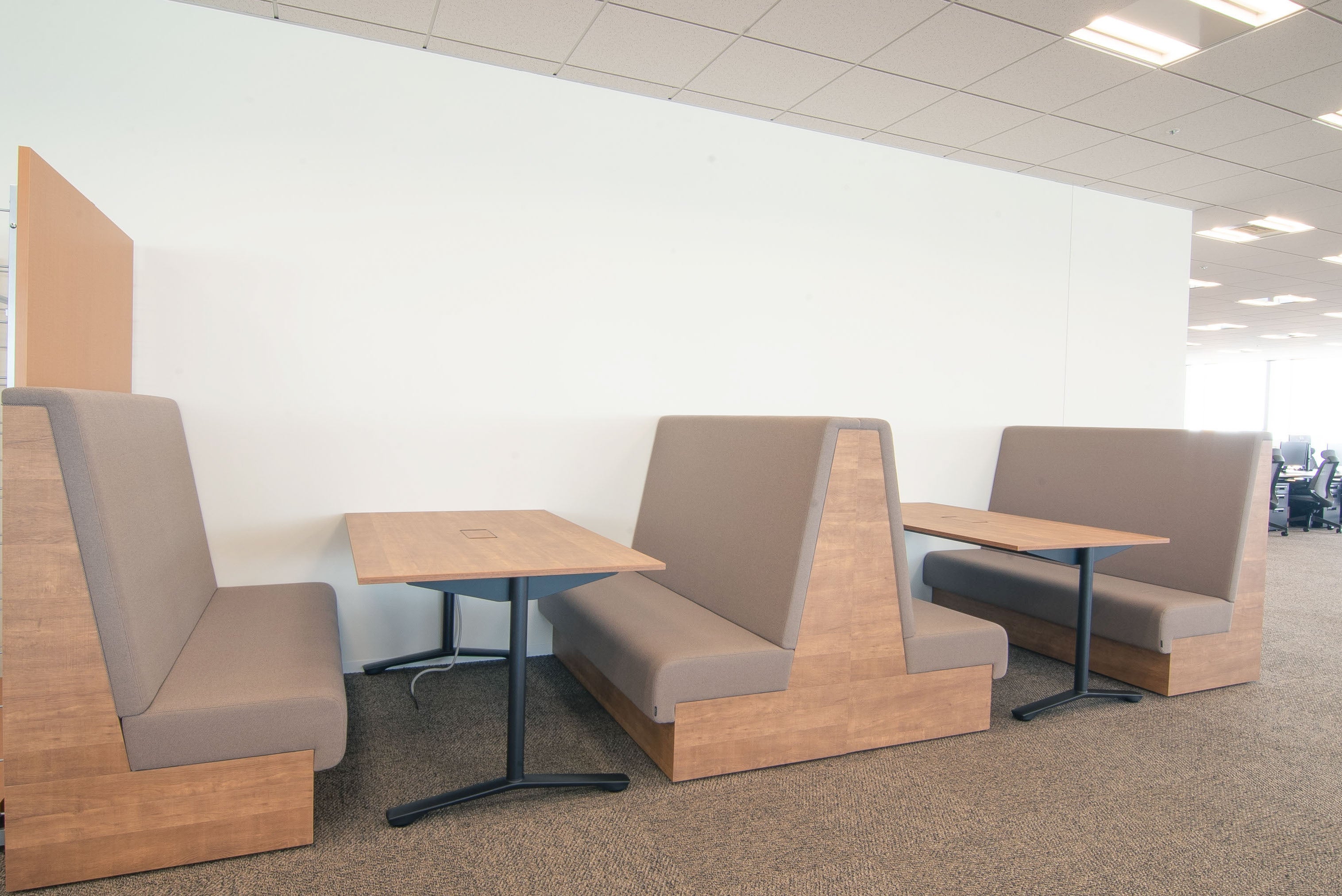 クイックコミュニケーションや社内ミーティングで利用しやすいコミュニケーションエリアを執務室に新設。執務室内であることと、各席にモニターを完備することで、用途に応じて最適なコミュニケーションを迅速に実現していただけます。