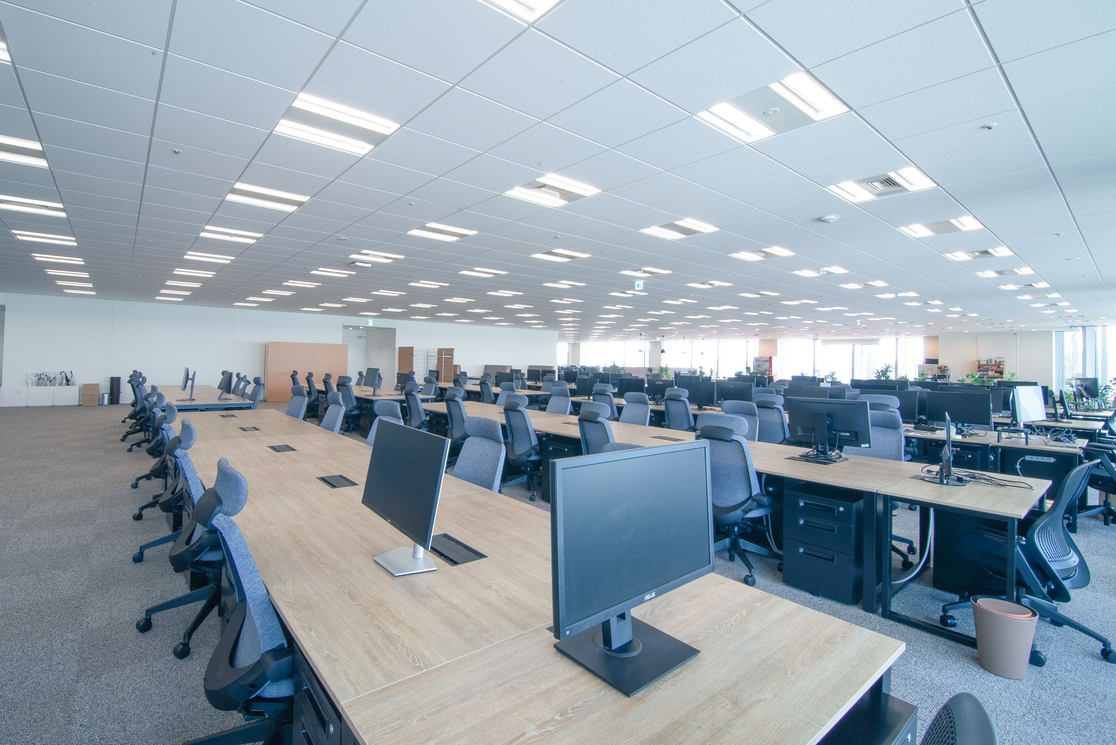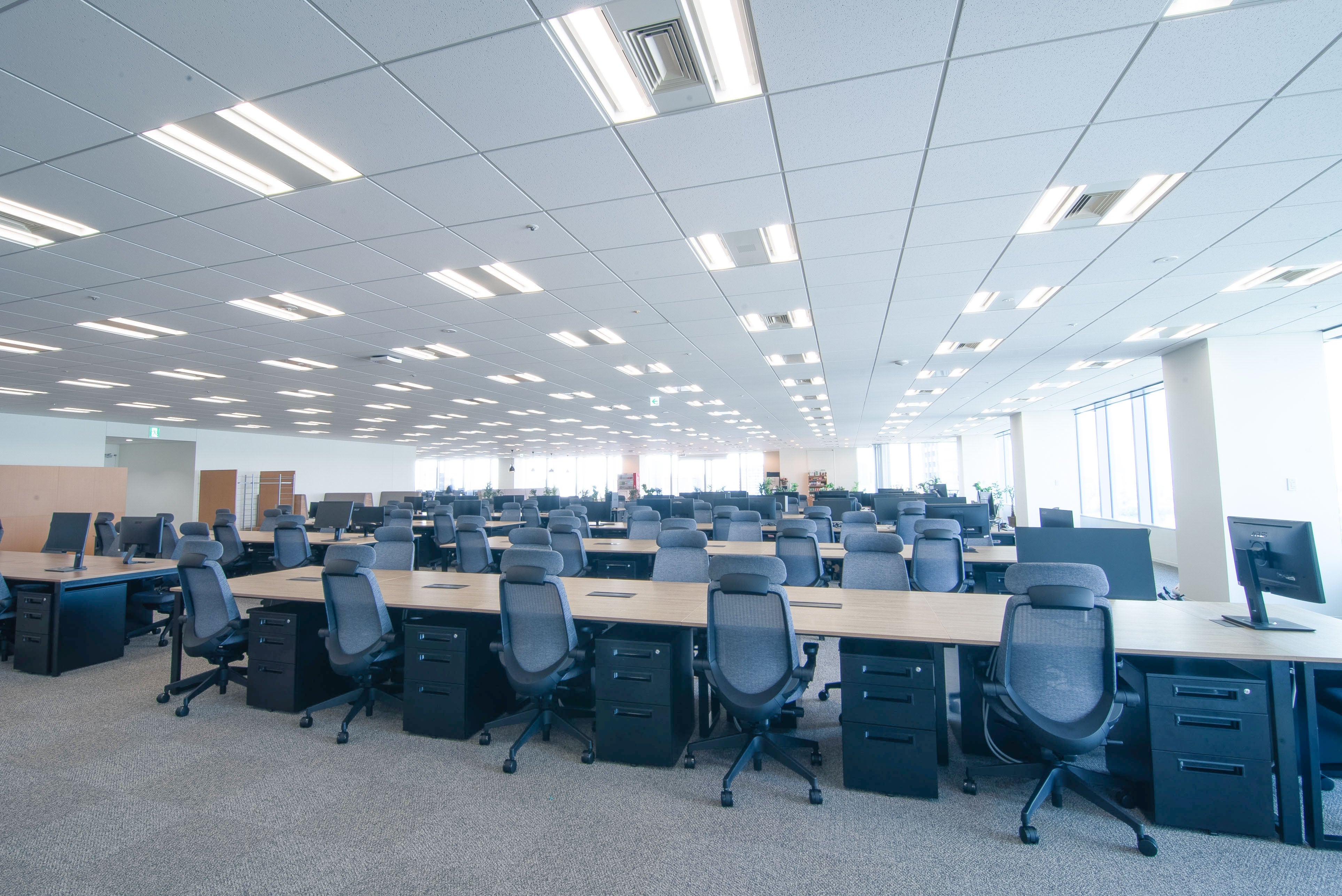 部署の垣根を越えた従業員同士のコミュニケーションが活性化するよう、最大限壁を減らしたワンフロアのオープンスペース。広々とした空間により、圧迫感なく気持ちよく業務に集中できる環境にすることを意識しました。