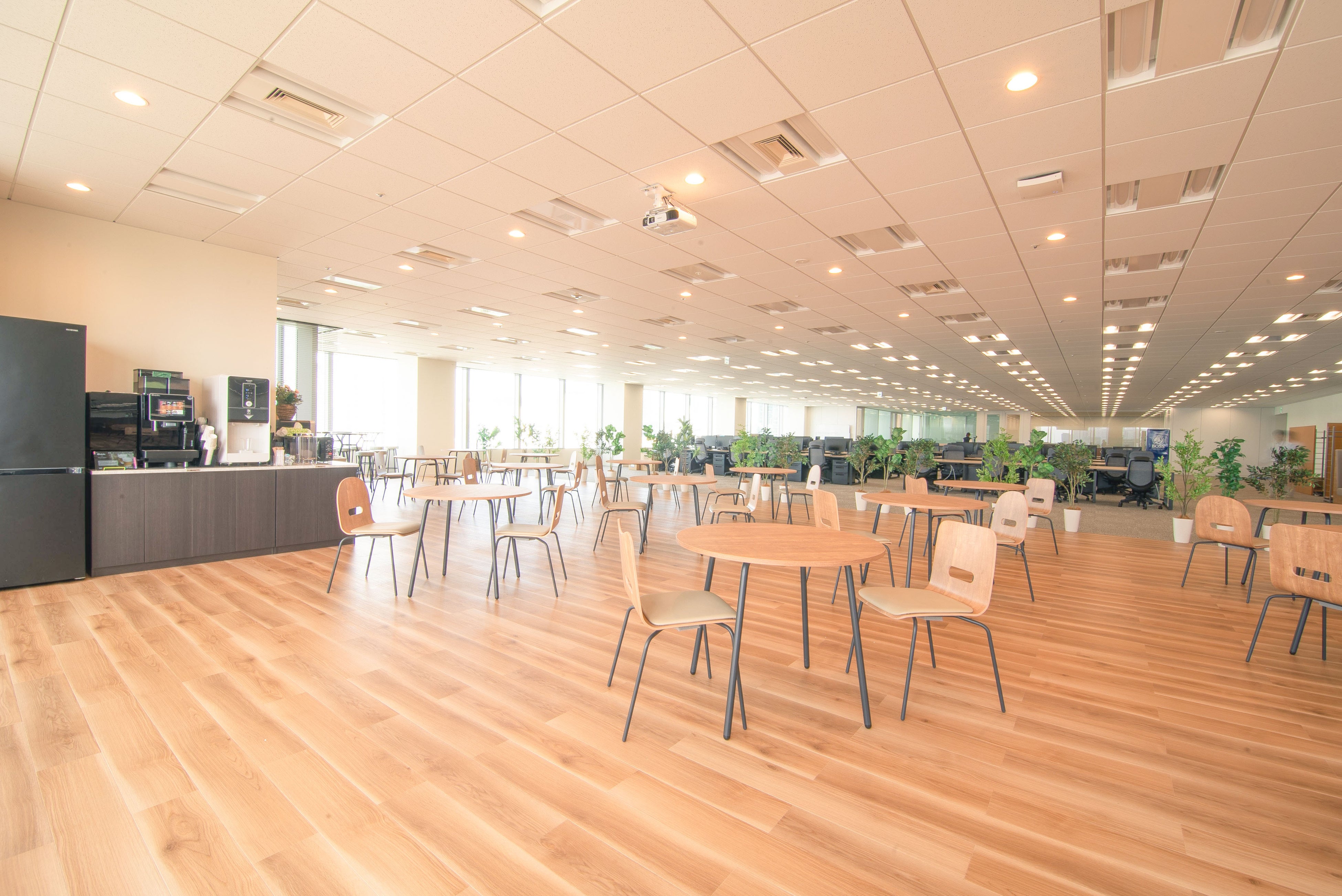 休憩時間に利用する広々としたカフェスペースを設置。業務時間と休憩時間のオンオフを切り替え、メリハリをつけて仕事をできるよう、照明・床・家具を工夫して他のスペースとは異なる空間を表現。