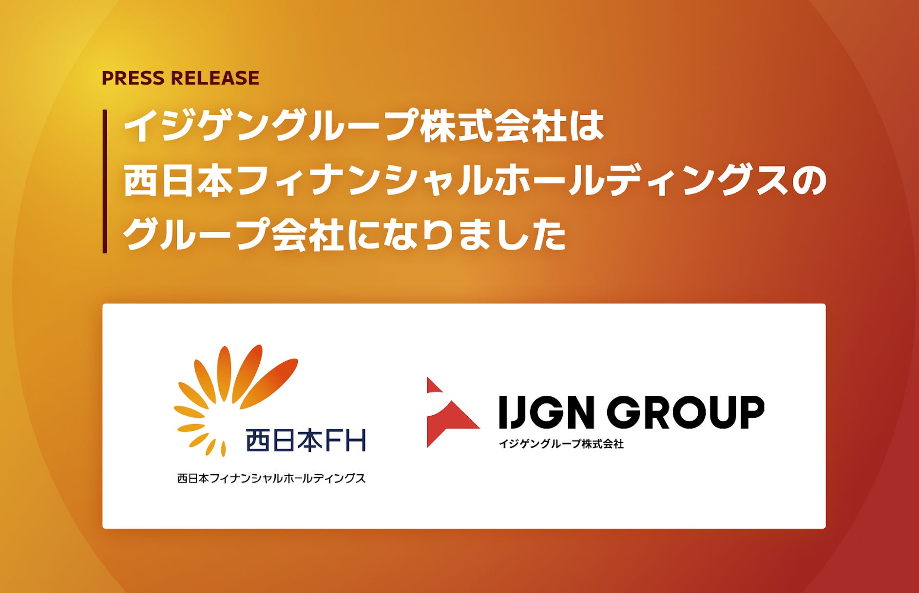 イジゲングループ株式会社(本社:大分県大分市、代表取締役CEO:鶴岡 英明、代表取締役専務CFO:鍋島 佑輔、以下「イジゲングループ」)は、株式会社西日本フィナンシャルホールディングス(本社:福岡県福岡市、取締役社長:村上 英之、以下「西日本FH」)へ株式譲渡を行い、グループ会社となりましたことをお知らせいたします。
