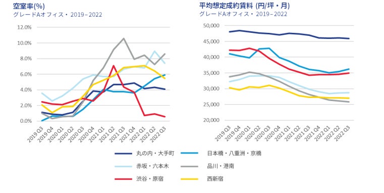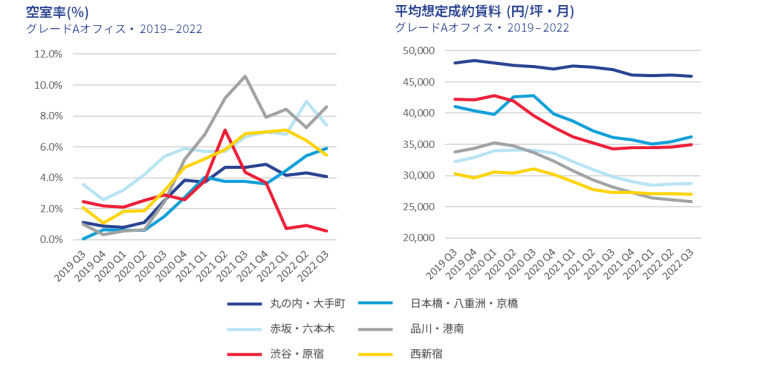 一方で、7〜9 月期のネットアブソープション※2は新規供給量を上回り、空室率は小幅ながら低下しました。全体として、需要は回復傾向にあり、 2022 年前半までは新規供給量が少なかったことに加え、これまで低調だった大型のテナントに動きが出始めたことから、一部で既存の大型の空室の埋め戻しが進んだことが寄与したものと考えられます。