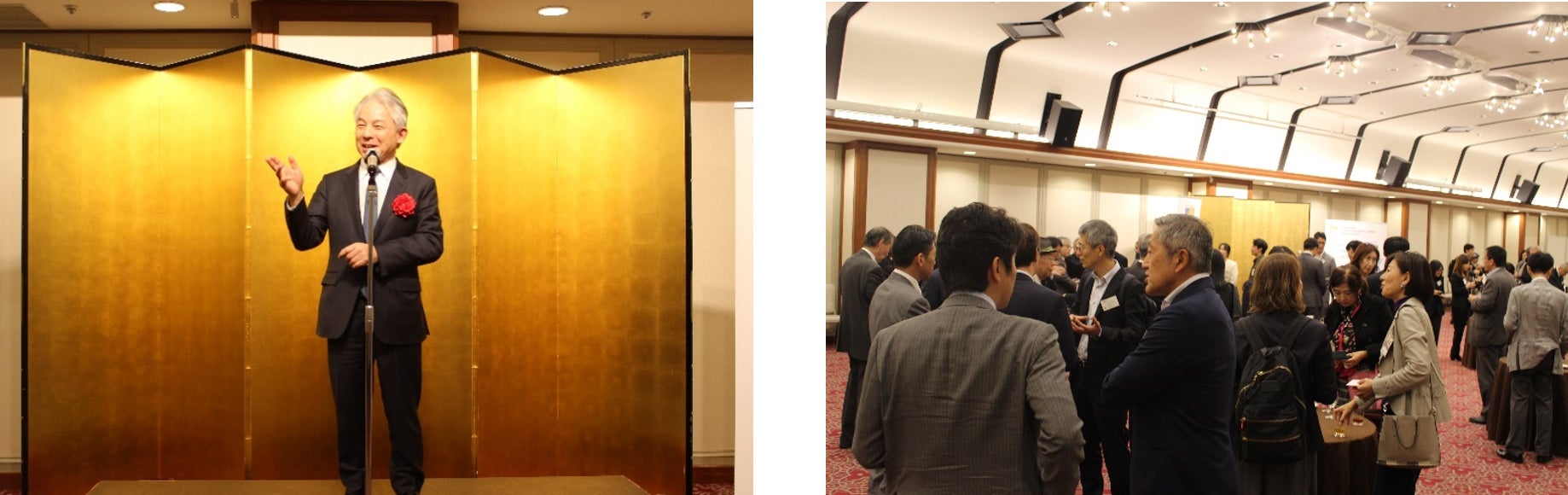 住友商事株式会社の南部智一取締役副会長は、香港が有する3つの強みとして、ビジネスプロフェッショナル、ビジネスインフラストラクチャー、そしてGBA(広東・香港・澳門大湾区)の巨大なエコシステムを挙げました。人材面では、法務、会計、科学技術などの分野において高い専門性をもつプロフェッショナル人材が揃っており、コモンローや簡素な税制など、世界でも類を見ないインフラを誇ると香港の優位性と魅力について力強く語りました。ロート製薬の山田邦雄代表取締役会長は、コンシューマービジネスにおけるプロモーション、香港の迅速な反応と柔軟な市場対応が企業にとって大きなアドバンテージであることを強調し、特に研究開発分野における目覚ましい発展について語りました。その後、香港貿易発展局の伊東正裕東京事務所長(日本香港協会理事)から香港貿易発展局と日本香港協会の事業紹介があり、日本香港協会佐藤征洋会長の閉会挨拶でシンポジウムは幕を閉じました。続くレセプションでは、アライアンス・フォーラム財団の原丈人会長による乾杯挨拶で華やかに幕を開け、登壇者と参加者間の歓談・交流が行われました。