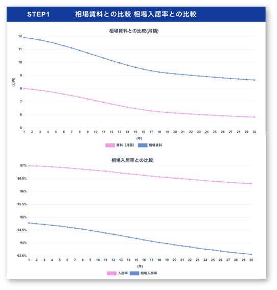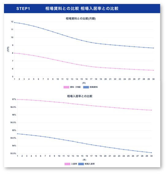 実際の賃料・入居率と Gate. が算出した相場の賃料・入居率を最長30年先まで比較することが可能です。