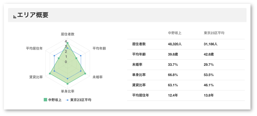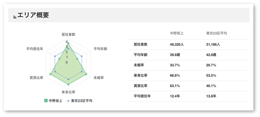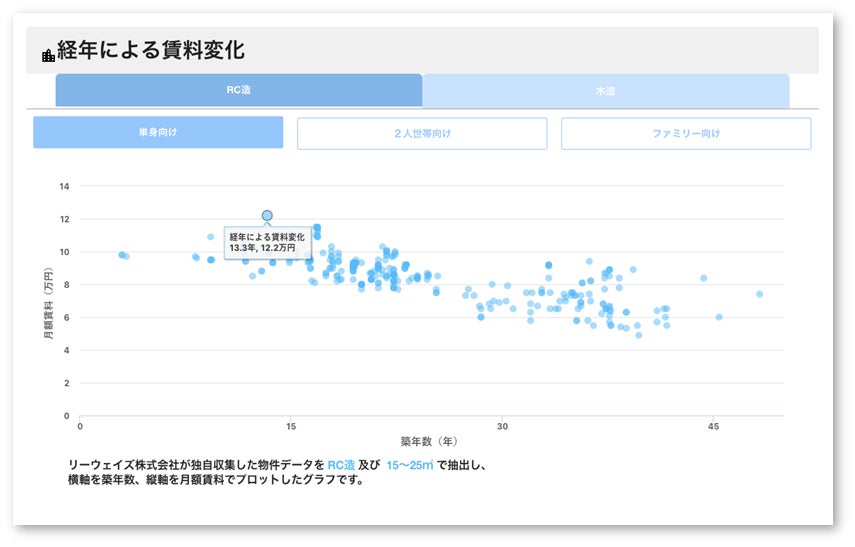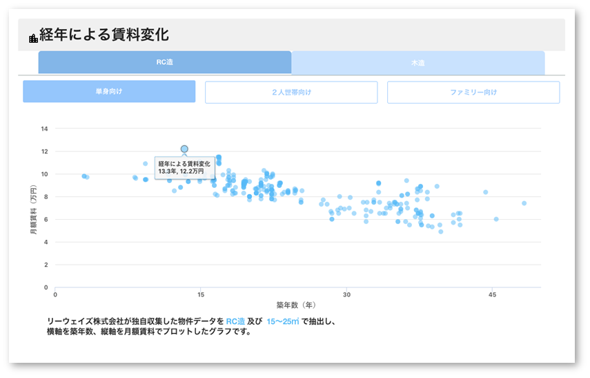 当社が保有する不動産マーケットデータを活用し、平均年齢等のエリア概要や、築年数による賃料分布を確認できます。