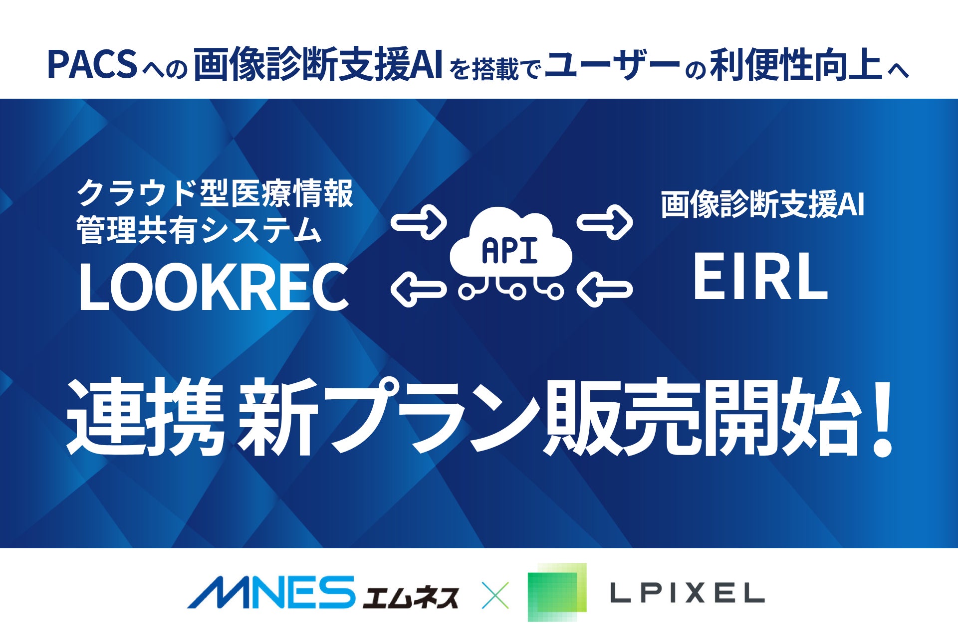 クラウド型医療情報管理共有システム「LOOKREC(ルックレック)」を提供する株式会社エムネス(所在地:広島県広島市、代表取締役社長 阿部 伸一、以下「エムネス」)は、エルピクセル株式会社(本社:東京都千代田区、代表取締役:鎌田富久、以下「エルピクセル 」)が提供する画像診断支援AI「EIRL(エイル)」とAPI連携(※)した新プランの発売をお知らせします。