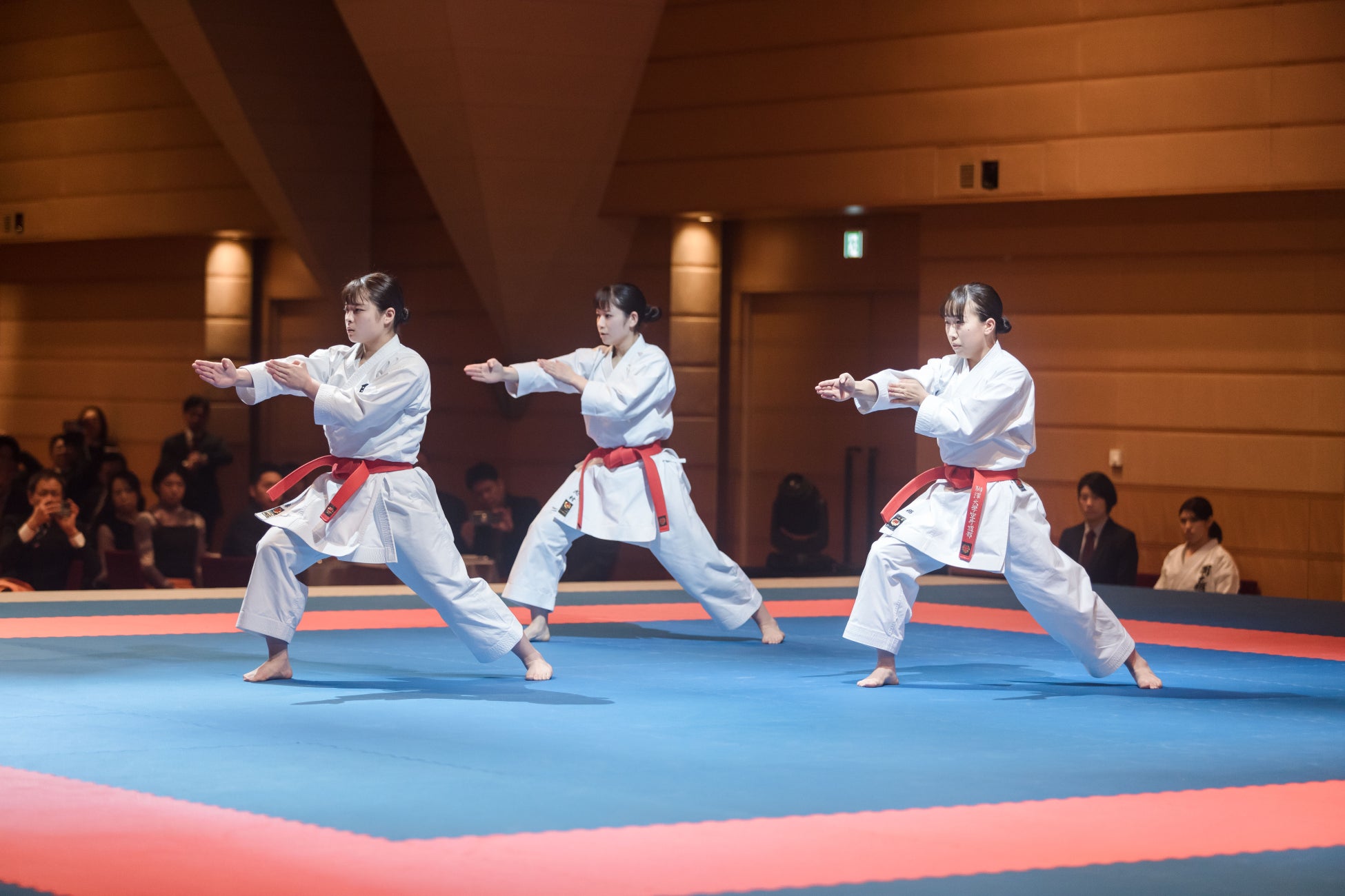 2日目には第3回全日本空手道団体形選手権大会の決勝も実施されます。形を3人一組でシンクロして行い、決勝では形の意味(攻撃や防御)を実演する「分解」を行う種目です。合図や音楽もなく見事に動きが一致する形と、殺陣のような迫力を持つ分解は空手を知らない方にも人気です。
