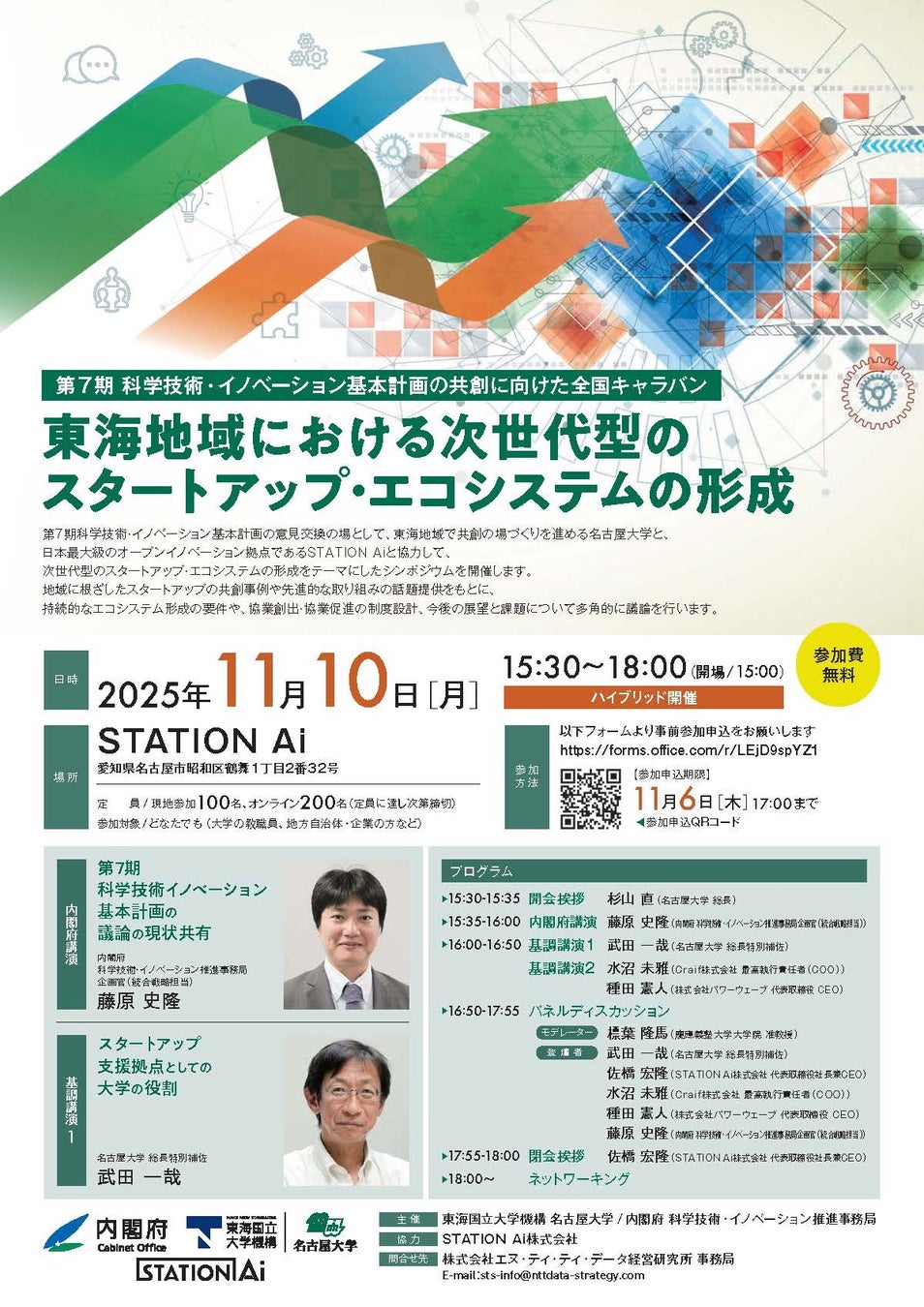 第7期科学技術・イノベーション基本計画の意見交換の場として、東海地域で共創の場づくりを進める名古屋大学と、日本最大級のオープンイノベーション拠点であるSTATION Aiと協力して、次世代型のスタートアップ・エコシステムの形成をテーマにしたシンポジウムを開催します。地域に根ざしたスタートアップの共創事例や先進的な取り組みの話題提供をもとに、持続的なエコシステム形成の要件や、協業創出・協業促進の制度設計、今後の展望と課題について多角的に議論を行います。 |