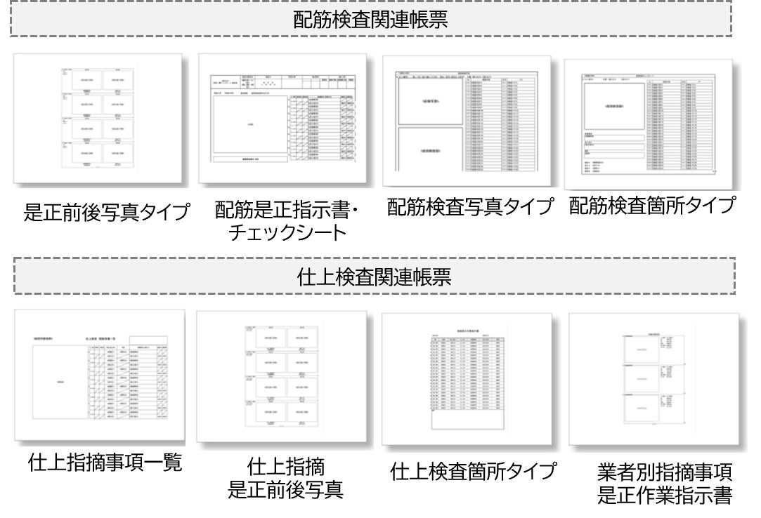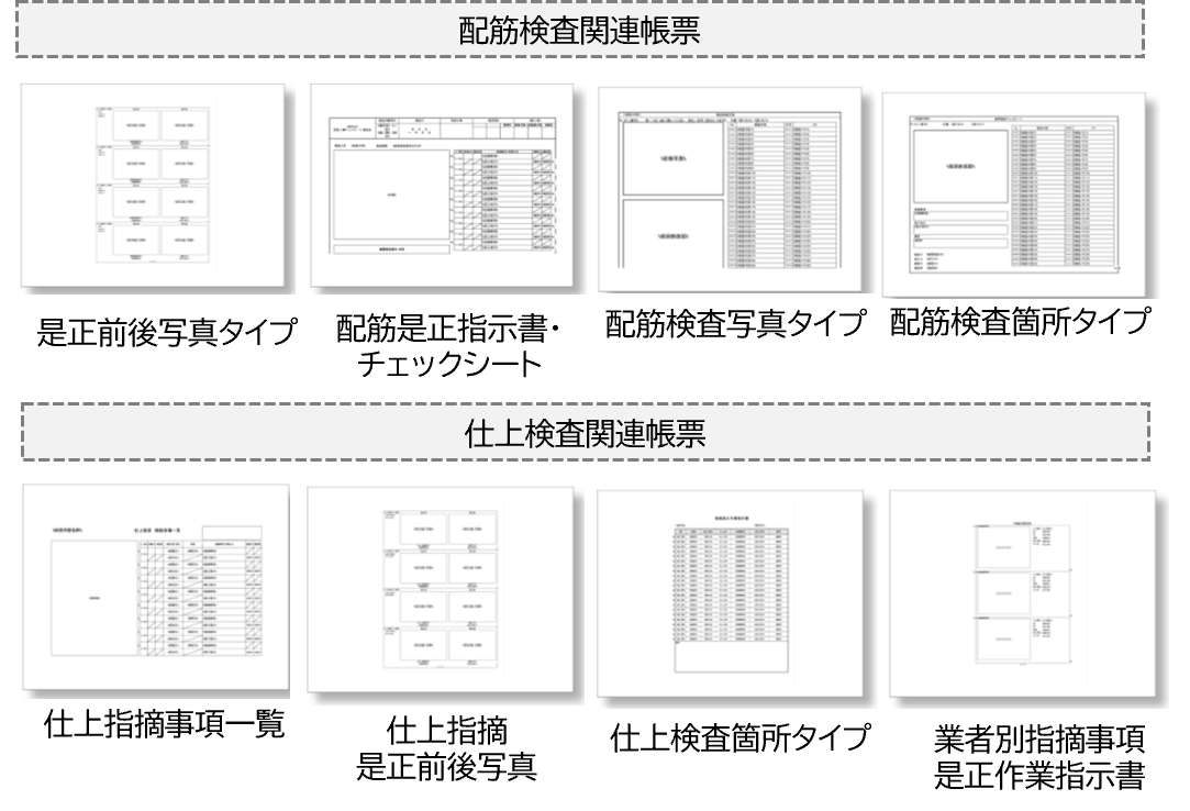 配筋検査の是正前後写真のアルバムや、協力施工会社毎の仕上検査の指示書など、検査に関連する帳票の雛形を標準搭載。その他、オリジナルの帳票についても作成可能です。