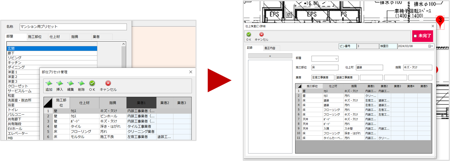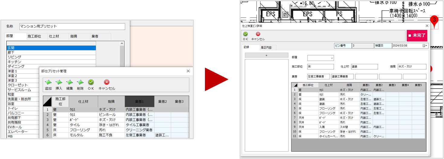 よくある指摘項目を簡単登録できるプリセット機能を搭載。仕上検査の際は、項目を選択するだけの簡単操作で情報の登録が可能です。指摘内容は一覧での確認も可能です。