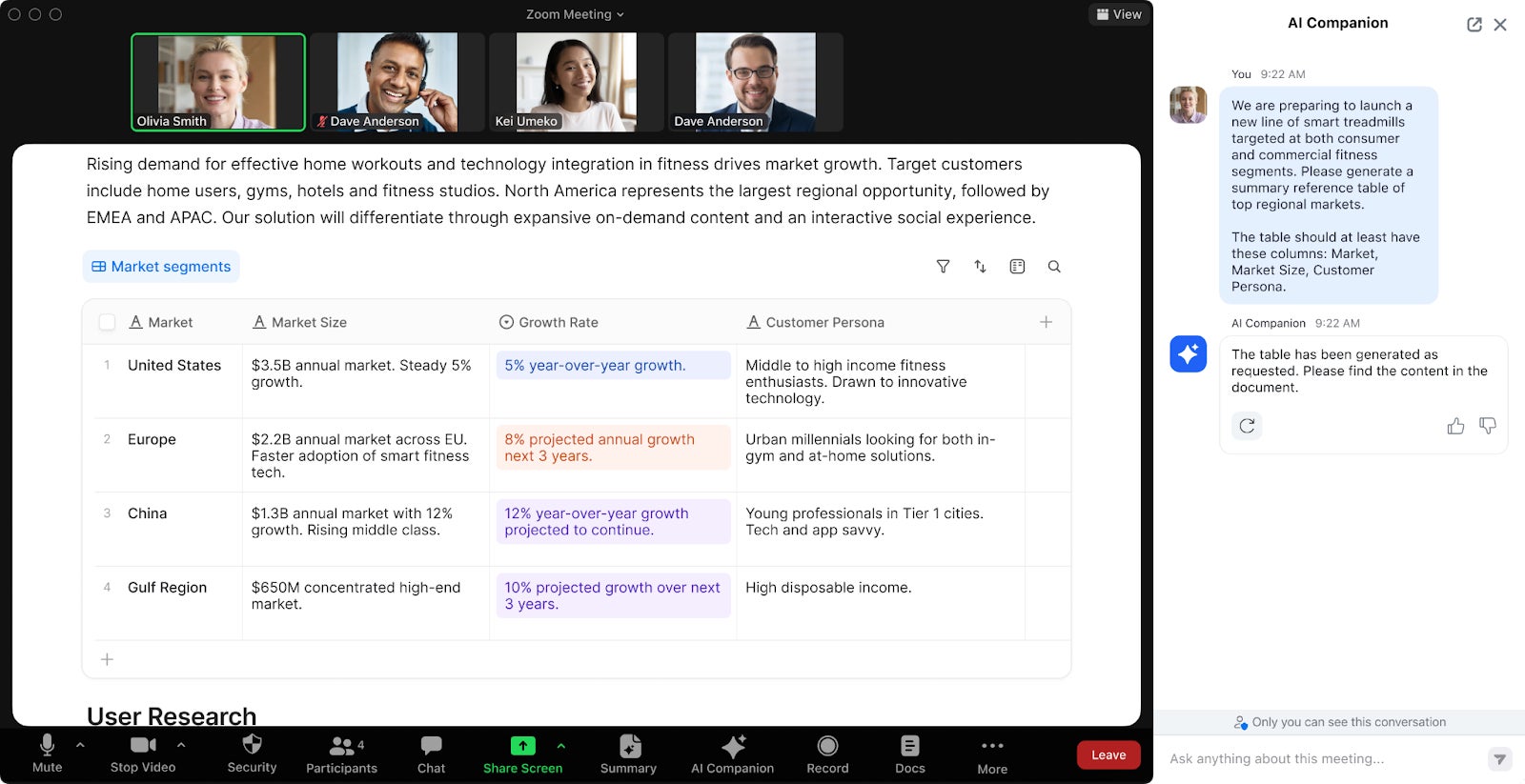 ● ユーザー フレンドリー: さまざまなユーザーのニーズを考慮し、Zoom Docs の使い方の習得の時間短縮につながる丈夫かつシンプルなユーザー体験が提供されています。タスクの依頼やインサイトのよりスピーディな取得、チームでのミーティング内容の把握などを行えるため、チームは目標に集中できます。