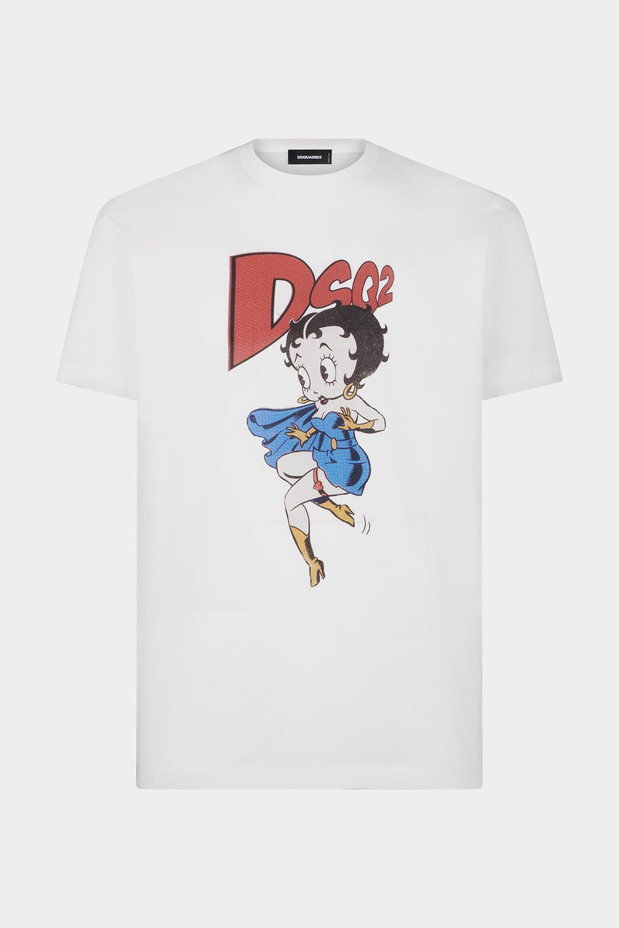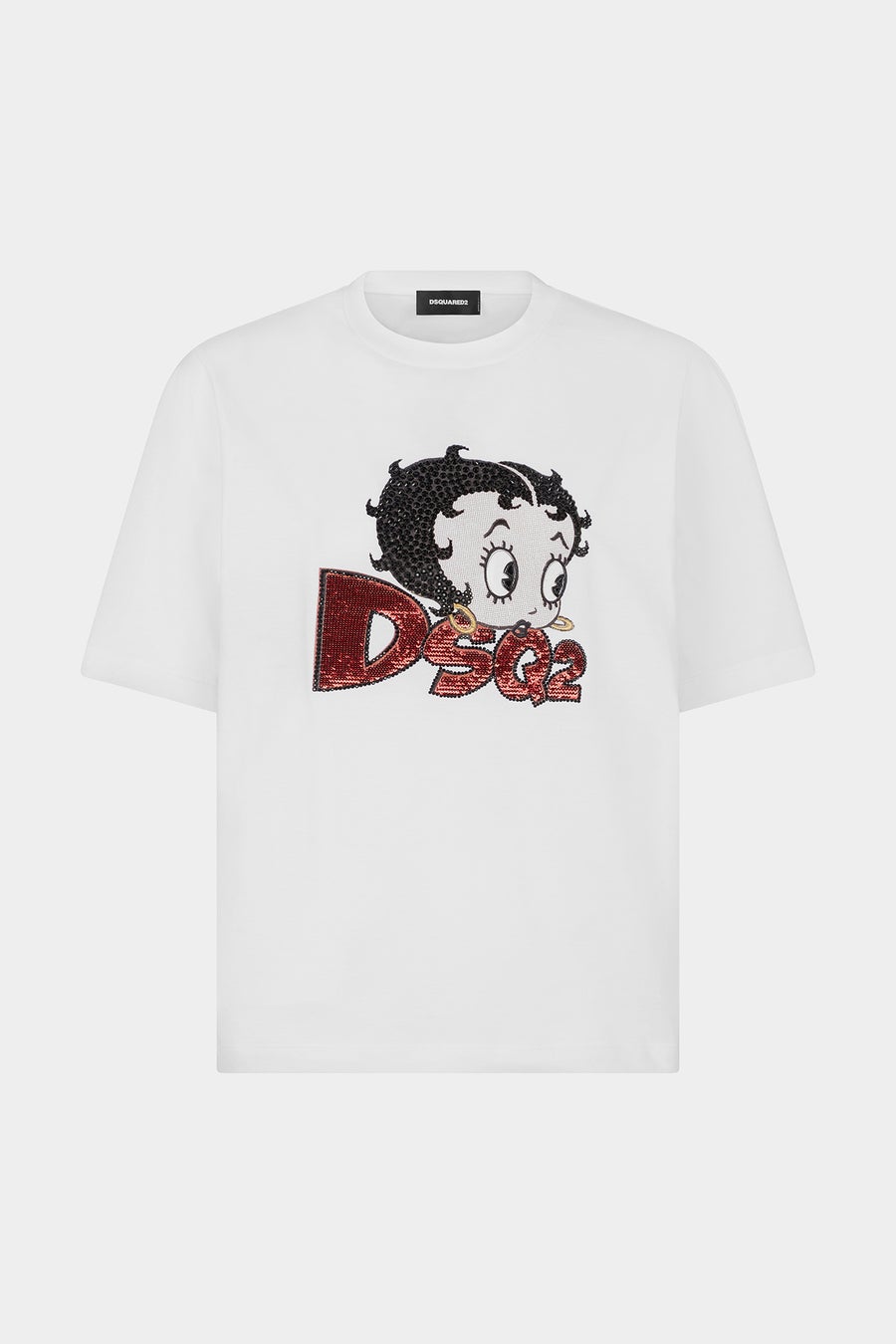 ブラックのパーカはフロントと袖にベティ・ブープのパッチが、メンズのホワイトのコットンTシャツにはベティ・ブープとDSQ2のレッドロゴがあしらわれています。