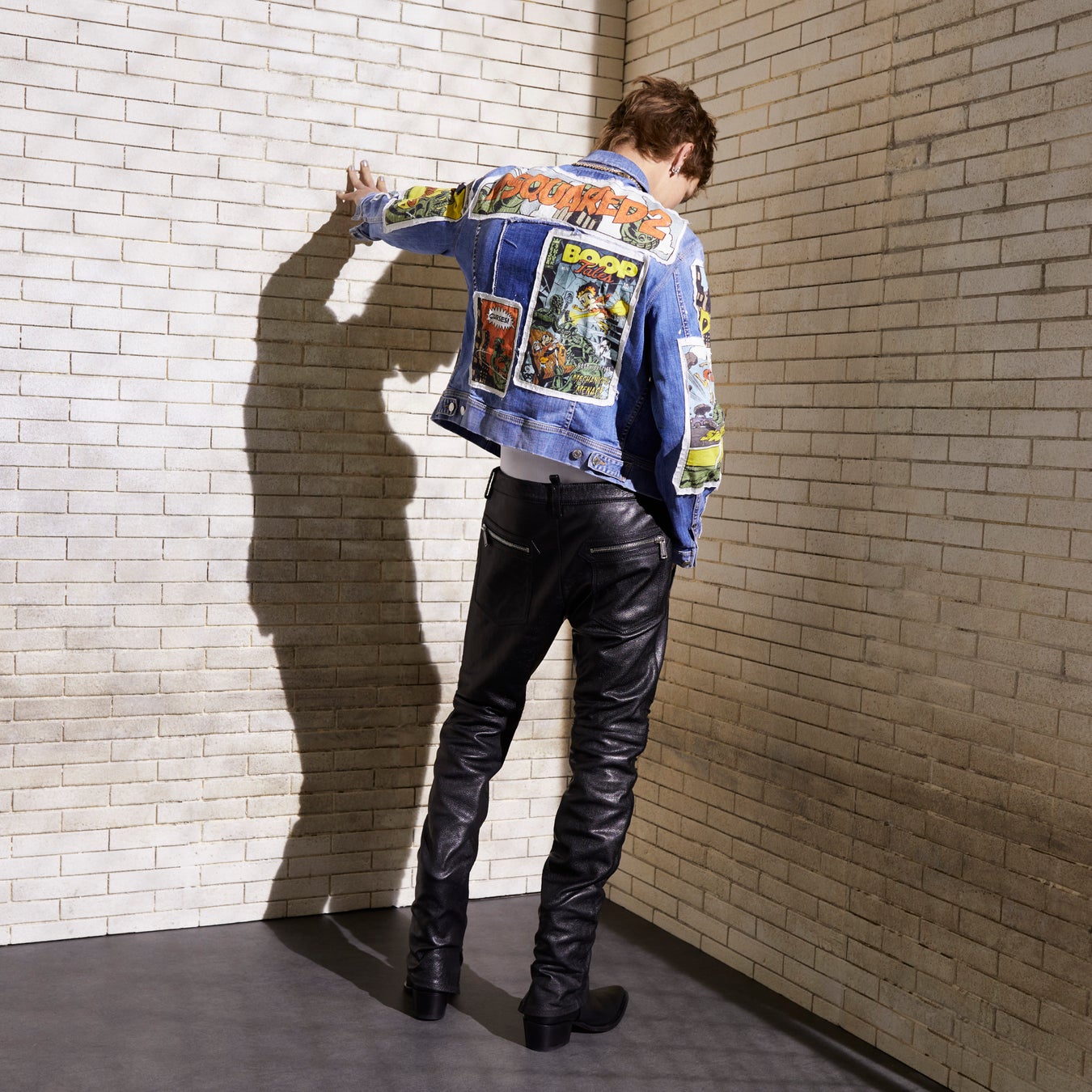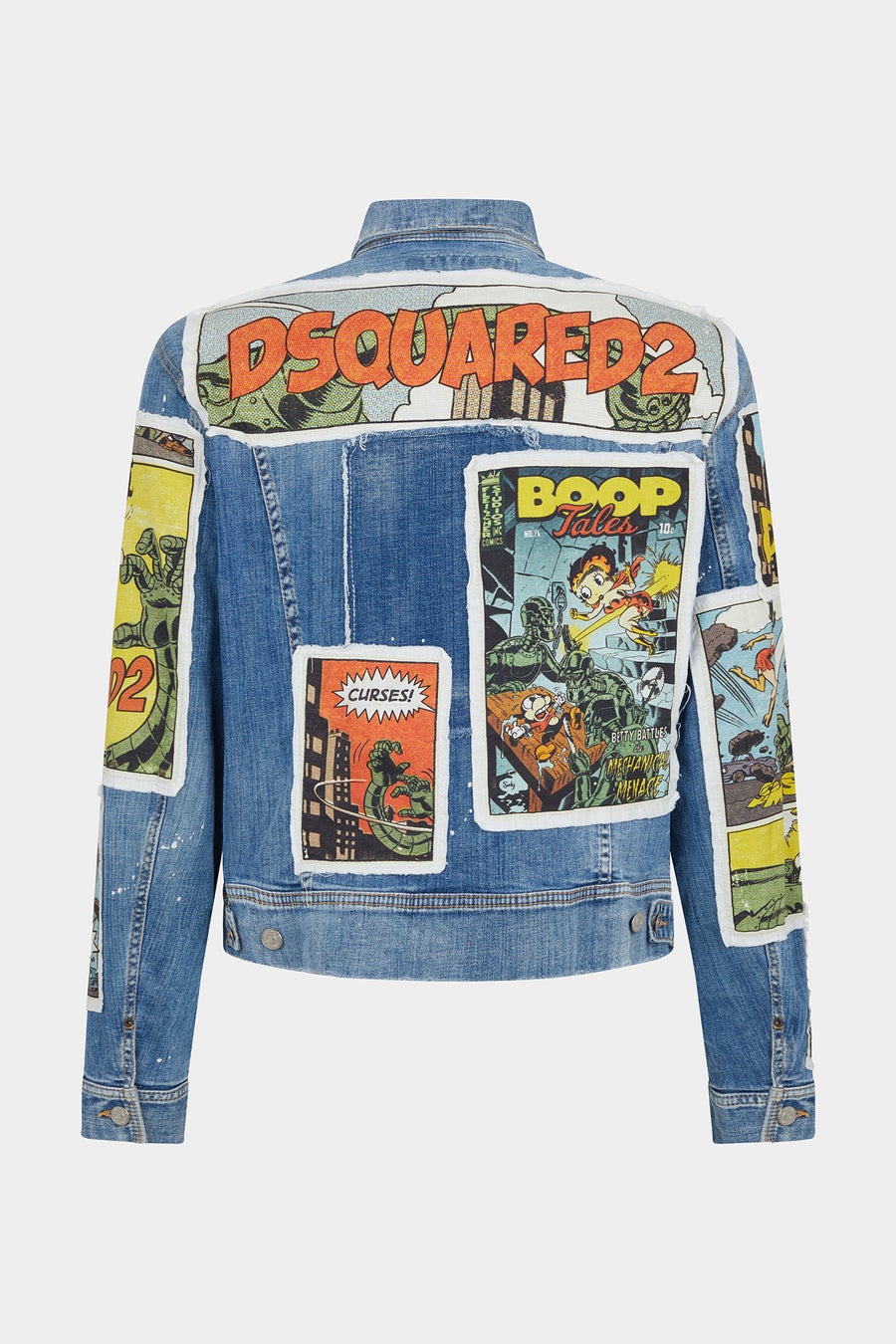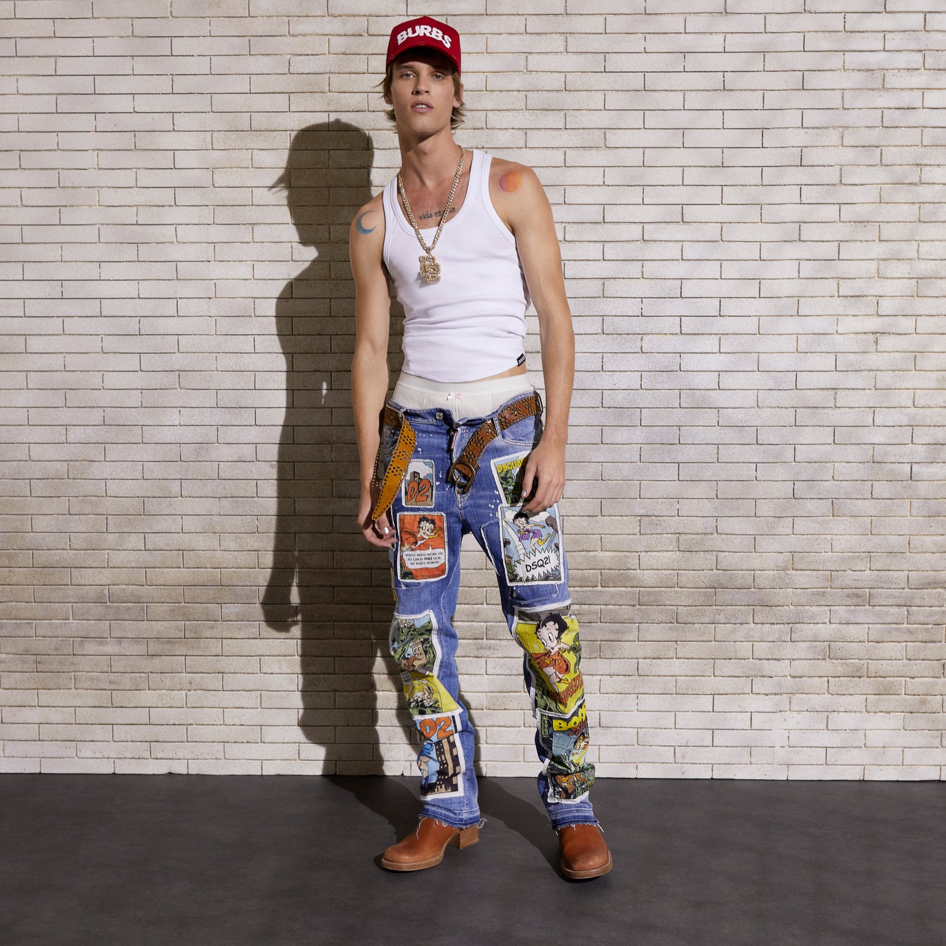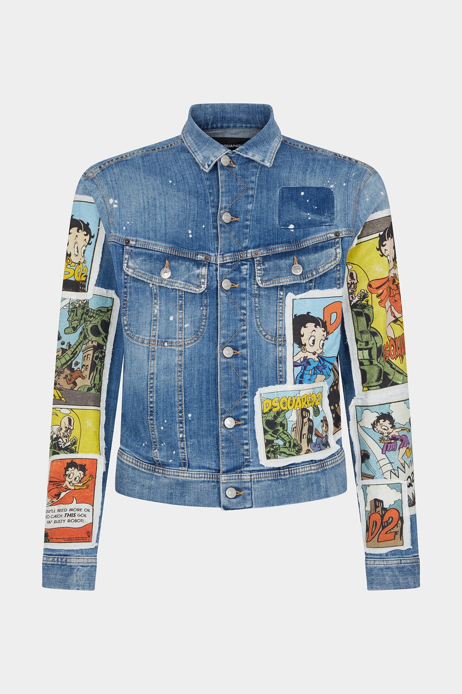 ライトブルーウォッシュのメンズデニムジャケットとジーンズは、フロントとバックに長方形、時には重なり合うベティ・ブープのパッチワークプリントで飾られています。デニムジャケットには、ディースクエアードとベティ・ブープのロゴが組み合わされています。