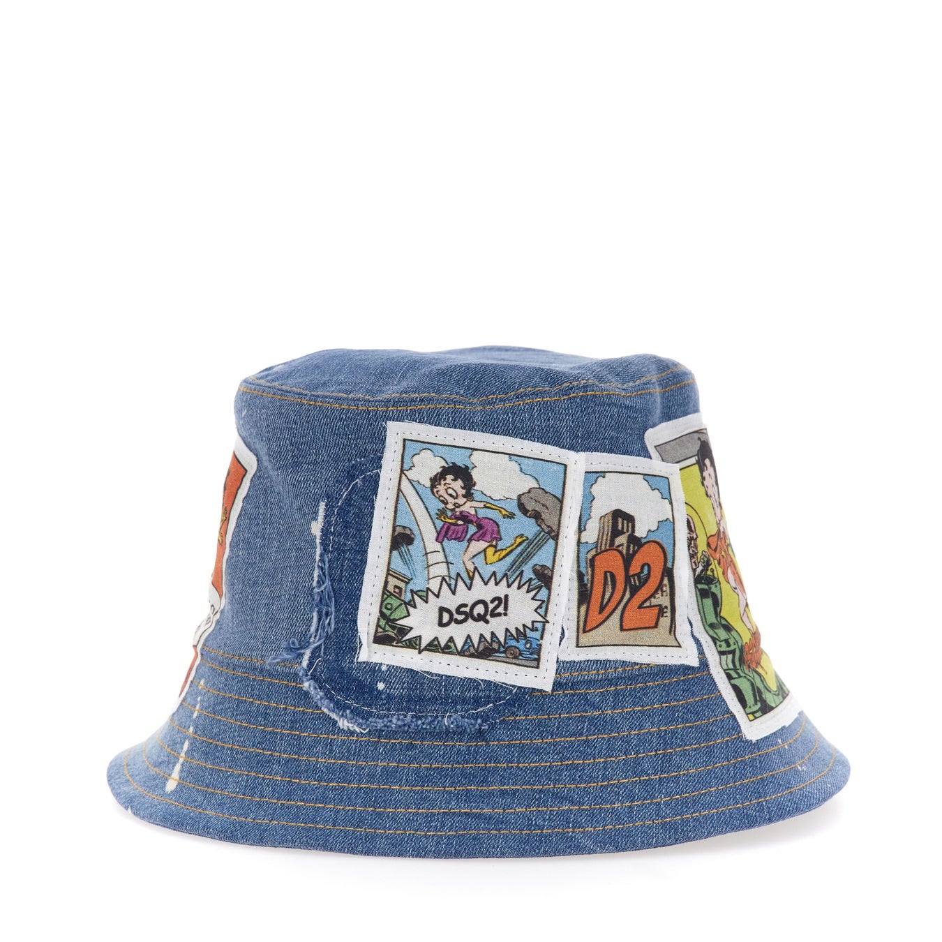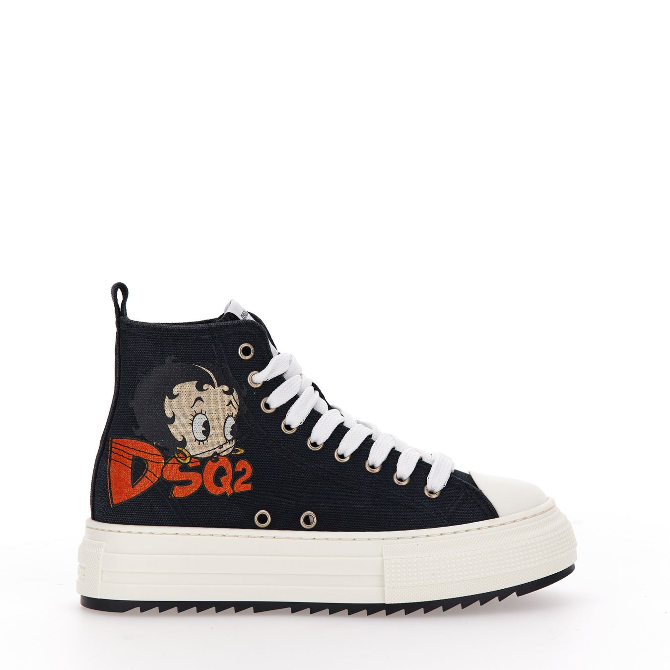 また、ディースクエアード特注デザインのベティ・ブープがベースボールキャップやデニムのバケットハットなどのアクセサリーに登場します。白い厚底のコットン製ハイライズスニーカーは、コンビネーションされたロゴがタンに、ベティ・ブープのキャラクターとDSQ2のロゴがサイドにあしらわれています。