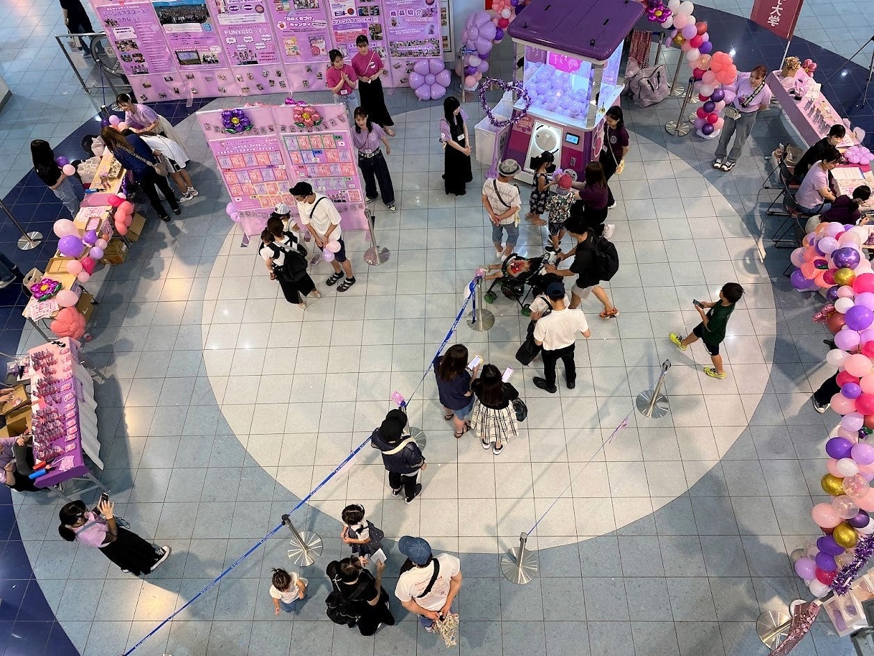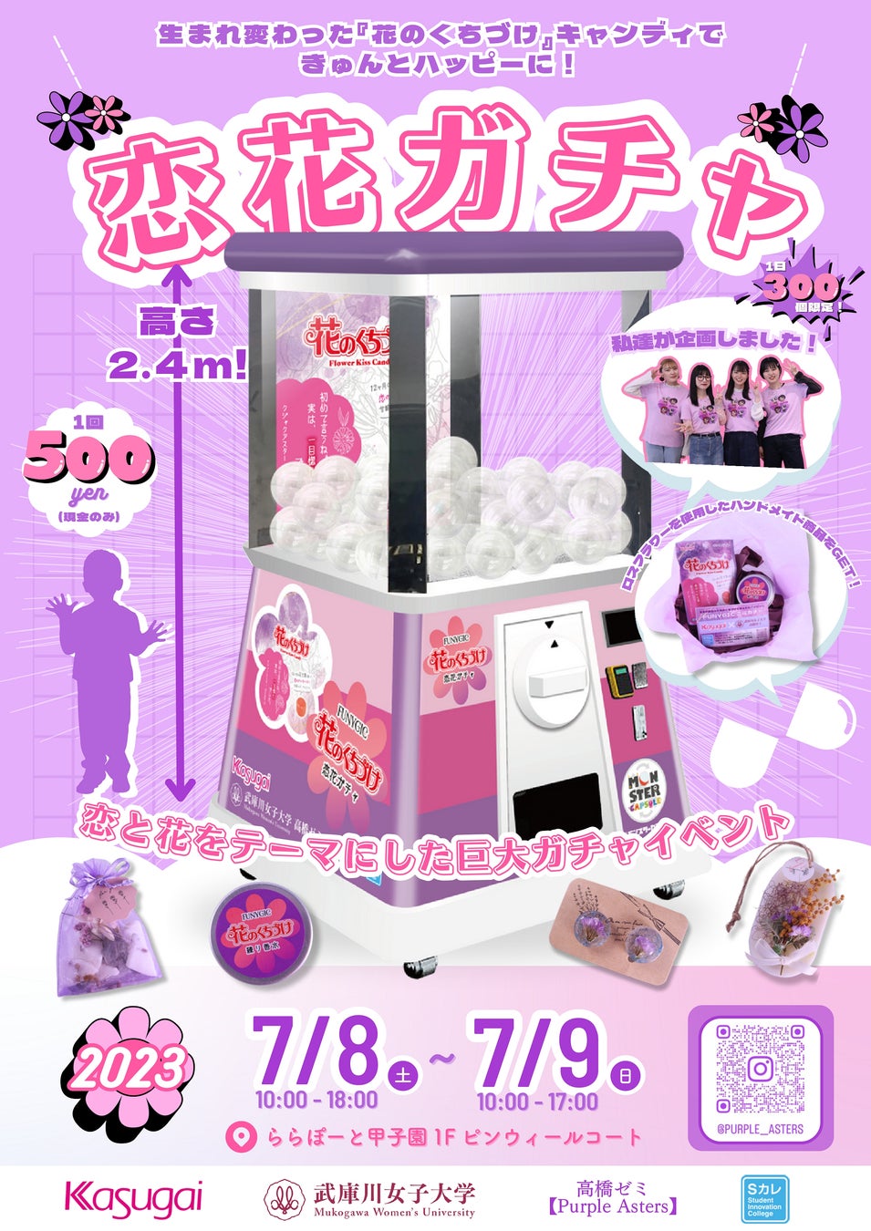 限定パッケージのお披露目イベントとして、兵庫県西宮市の商業施設「ららぽーと甲子園」にて2023年7月8日(土)、9日(日)の2日間、武庫川女子大学高橋ゼミと春日井製菓が共同で企画した「Funygic恋花ガチャイベント」を開催。会場には花のくちづけ仕様にラッピングされた全長2.4mの巨大ガチャを設置。限定パッケージの花のくちづけと共にロスフラワーを使用したハンドメイド雑貨をカプセルに詰め込んだ「SDGsについて楽しく学べる」イベントとして実施しました。