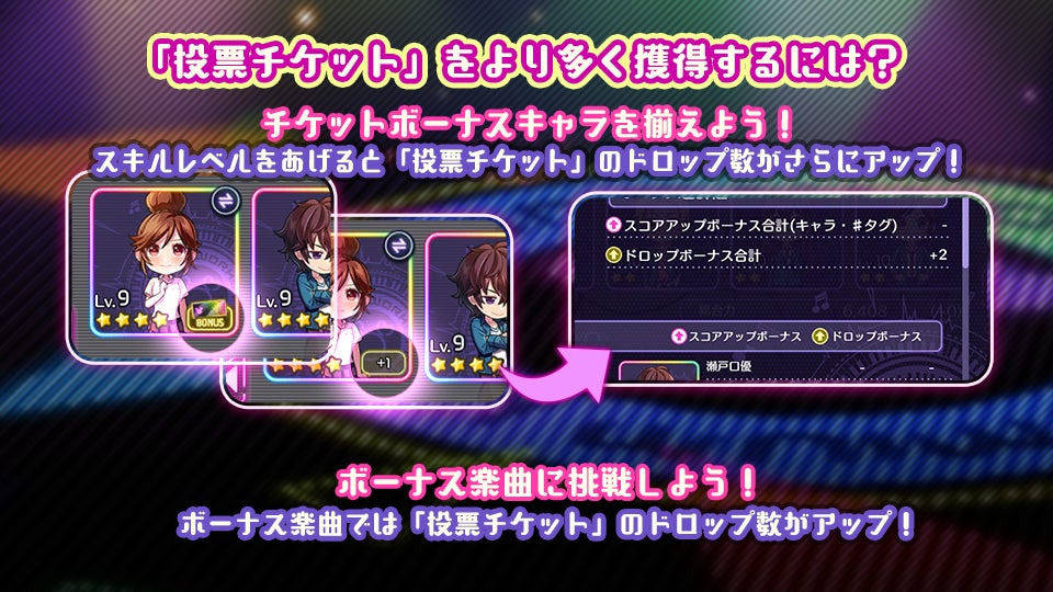 ※ボーナス楽曲のクリアやチケットボーナスキャラを編成してライブをクリアすると通常よりも多く「投票チケット」が獲得可能です。