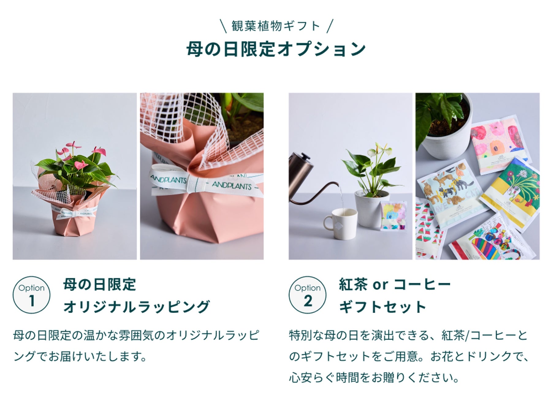 母の日のギフトにおすすめの観葉植物として、テーブルサイズのコーヒーの木とアンスリウム2種(ホワイト、ピンク)を販売。こちらの2商品を対象に、母の日限定のオリジナルラッピングやギフトセット(紅茶 or コーヒー )のオプションをご用意し、特別な母の日を演出します。長く大切に育てる楽しみを提供できるのも、観葉植物ならではのギフト選びのポイントです。