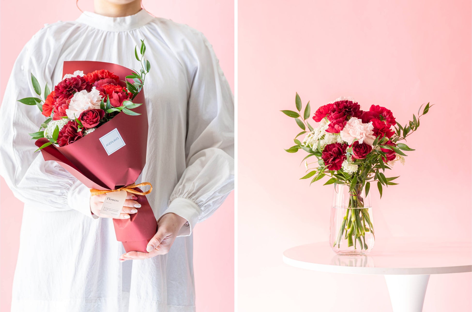 母の日定番のカーネーションをボリュームいっぱいに取り入れ、濃淡の違う赤色、ピンクのカーネーションを混ぜてグラデーションのように仕上げました。エレガントで品のあるデザインです。