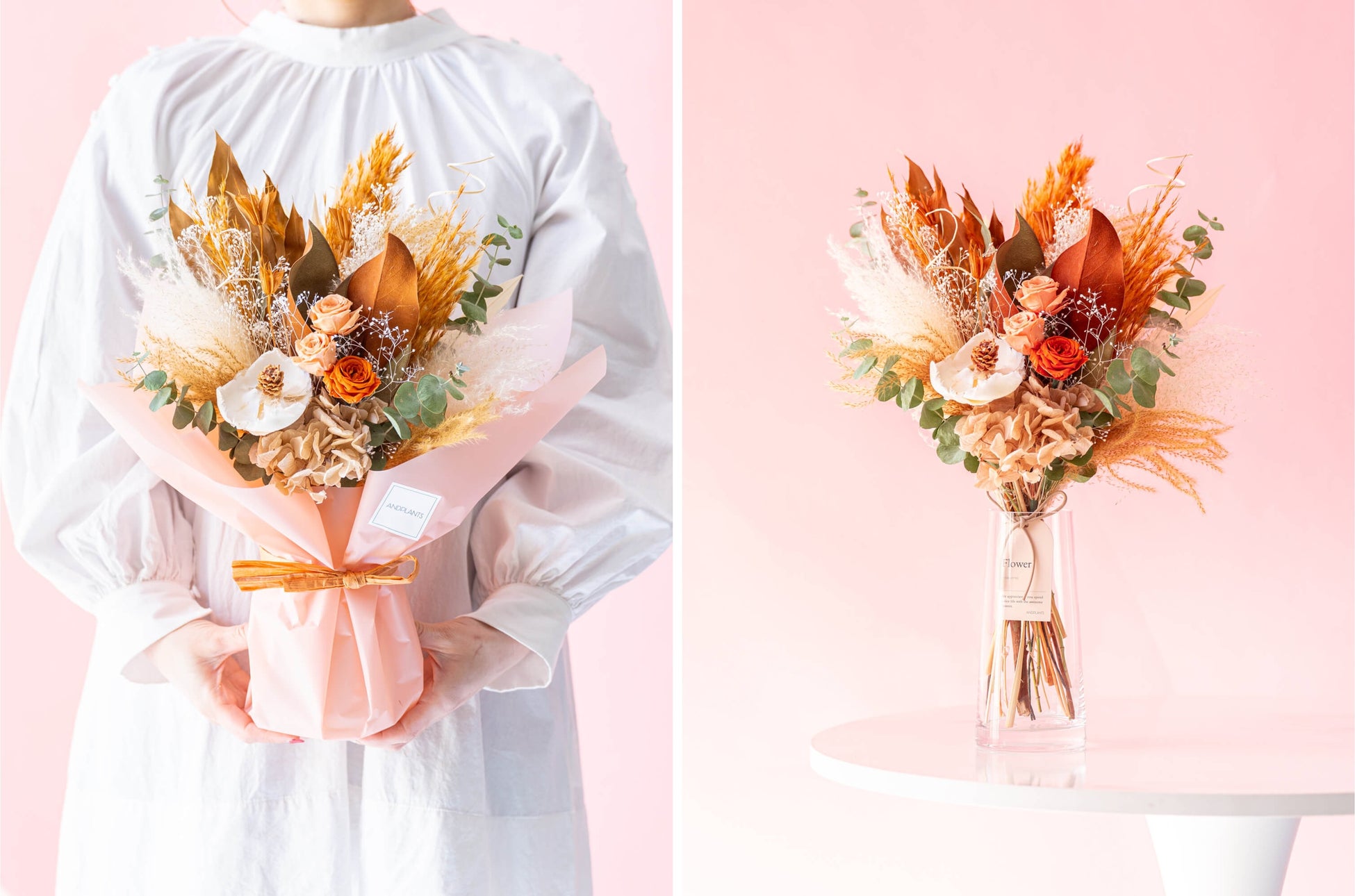 アンドプランツが提案する人気商品・ドライフラワー花瓶アレンジの現行ラインナップにはない、オレンジ色を基調とした珍しい色味の限定商品です。オレンジのバラをメインに、マグノリアリーフ、あじさいなどの人気のドライフラワーを用いて、クラシカルで上品なデザインに仕上げました。