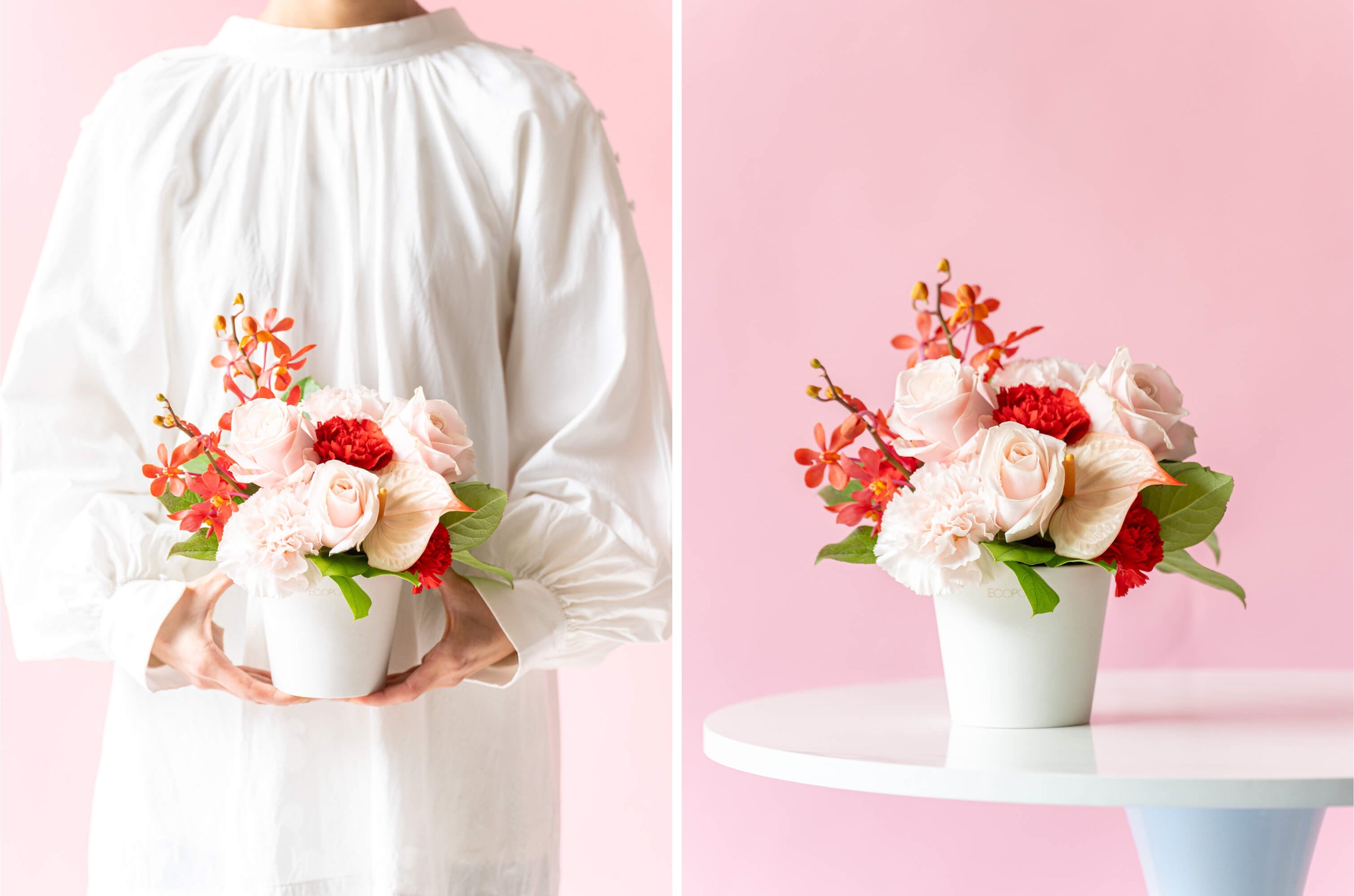 品のある淡いピンクのバラをメインに、2色のカーネーションやランを混ぜ、赤とピンクのバイカラーでまとめた愛らしいデザインのアレンジメントです。器が付いているのでそのまま飾っていただけます。