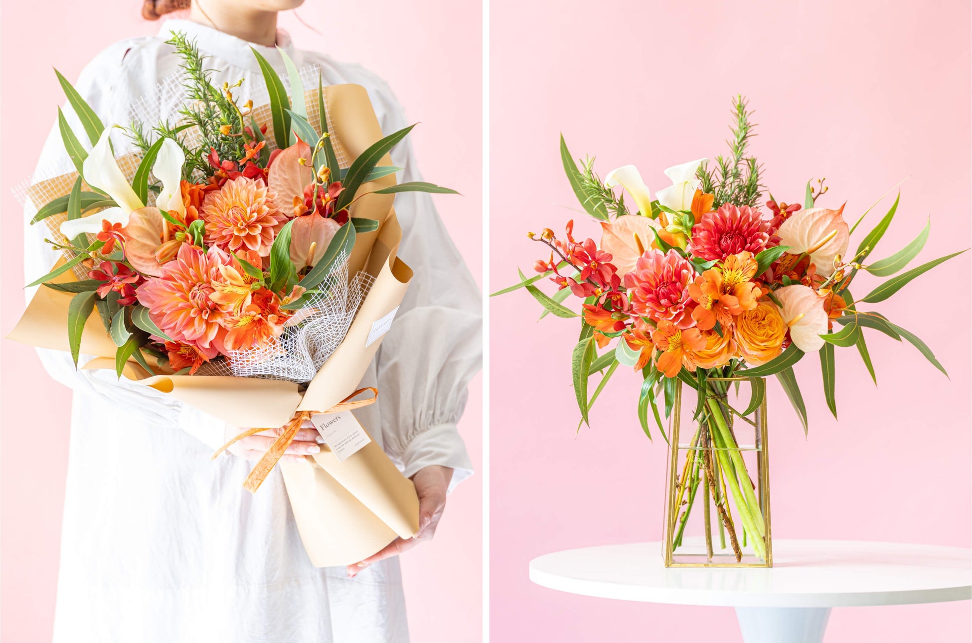 他の商品とは一味違った、ダリアをメインに鮮やかなオレンジ色が印象的なブーケです。華やかでトロピカルなデザインに仕上げました。母の日を豪華に彩ります。