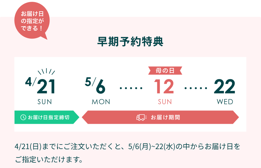 ■ 4月21日までの予約で、お届け日の指定ができる!早期予約がおすすめ