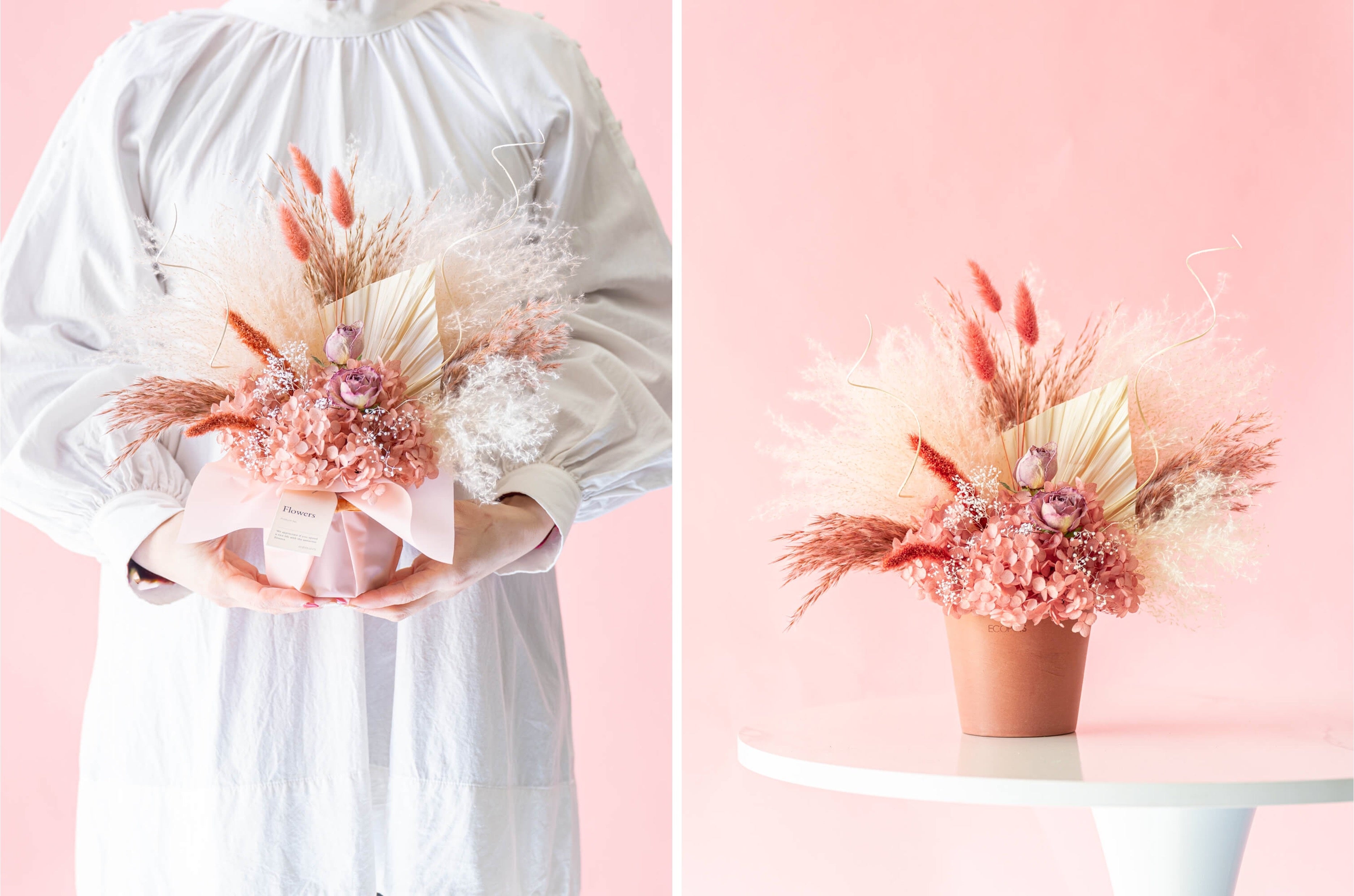 こっくりとしたピンク色に染まったあじさいのドライフラワーを主役に、ふわふわとしたパンパスをあしらった、モードなデザインのアレンジメントです。器が付いているのでそのまま飾ることができ、長くお楽しみいただけます。