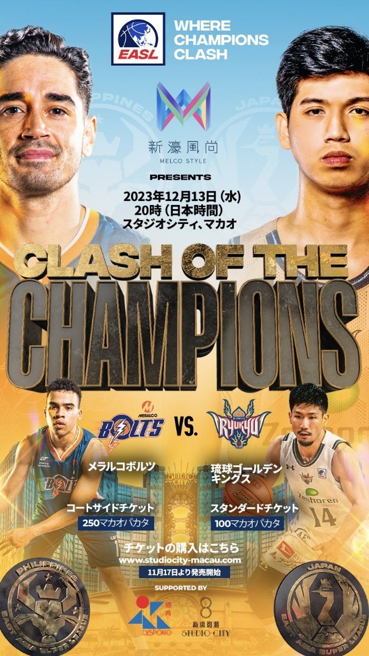 「メルコ・スタイルプレゼンツ Clash of the Champions」となる本試合は、メラルコボルツと琉球ゴールデンキングスの対戦を通して、東アジアのバスケットボールとスポーツエンターテイメントの最高峰を観客の皆様にお届けいたします。本試合は、エンターテインメント・ブランドのメルコ・スタイルが大会スポンサーを務め、提携リゾートのスタジオ・シティが会場スポンサーとなり、マカオに集まった観客の皆さまに迫力ある試合を提供します。