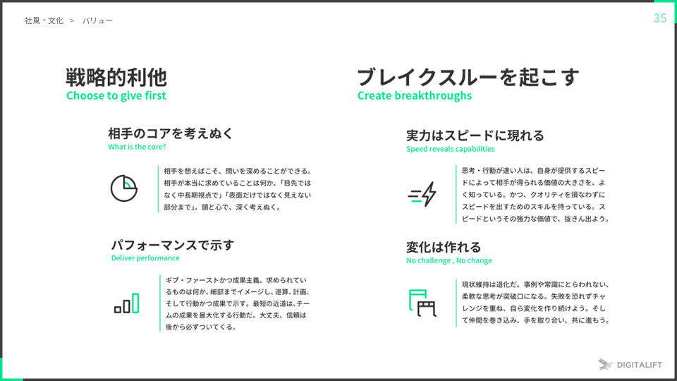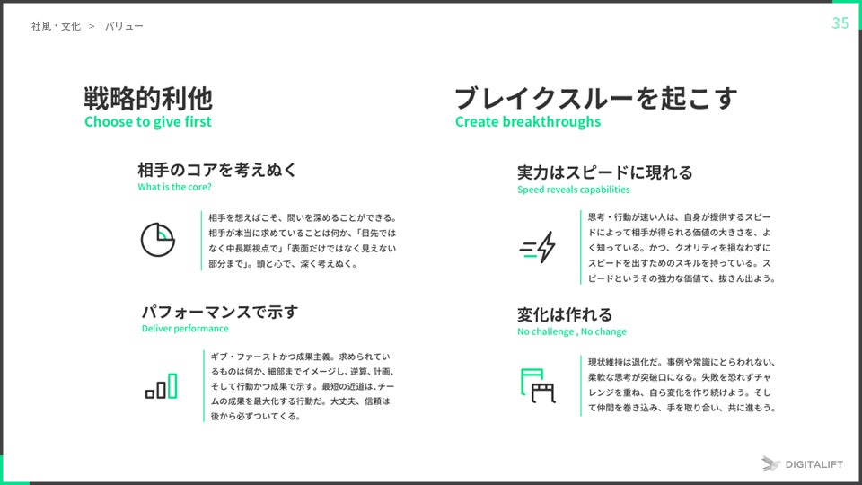 2022年11月に10周年を迎え、自分たちの価値観である「バリュー」を改定したデジタリフトは、内容・デザインともに一新した会社説明資料 2023年版を公開いたしました。求職者により働くイメージや会社の文化を理解してもらえるよう、メンバーの様子や会社の雰囲気などカルチャー要素の充実を図りました。さらに、2021年公開時から大きく変化した点としては、すべてのマーケティングサービスを並列に扱うようになったことが挙げられます。これまでは広告運用をメインとし、周辺領域としてアフィリエイトや、SEO、制作などのサービスを提供してきましたが、今後は各サービスの垣根をこれまで以上になくし、より包括的なデジタルマーケティングを行えるような組織体制へ移行します。デジタリフトは各々の専門領域こそありますが、業務が縦割りになっておらず、自らの職域からはみ出して提案することなども大いに推奨されているため、カルチャーにもマッチし、サービスの質向上にもつながると考えています。