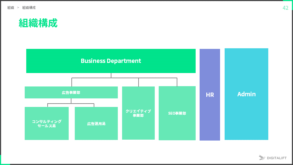予算規模、業種にかかわらず様々なクライアントへの対応が可能で、多彩なサービスから最適なソリューションを提供できる組織体制を構築しています。部署間の連携が自由にとれる体制のため、クライアントへの提案の幅も広がり、より成果にコミットすることが可能です。