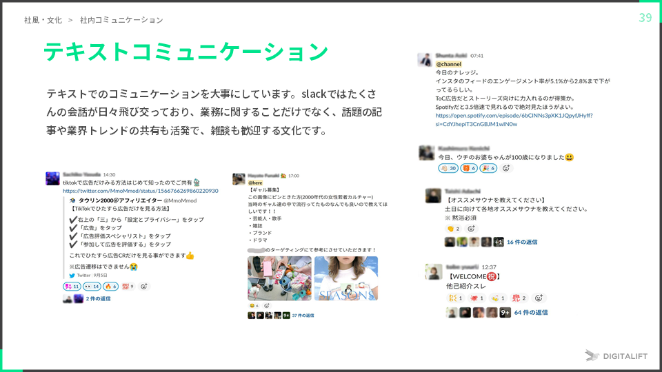 2022年5月より出社とリモートのハイブリットワークを開始し、また他拠点との連携も密なデジタリフトでは、オンラインとオフラインの垣根のない円滑なコニュニケーションを図る文化が根付いています。その一環として、社内のテキストコミュニケーションの一例を紹介しています。