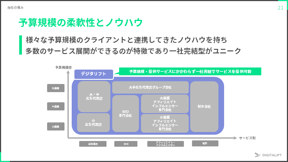 また、インフルエンサーマーケティング、スタートアップ支援等の新規サービスの追加や、扱う業種の幅広さ、業務効率化の仕組みなど、当社の強みをさらに具体的に反映した内容となっております。