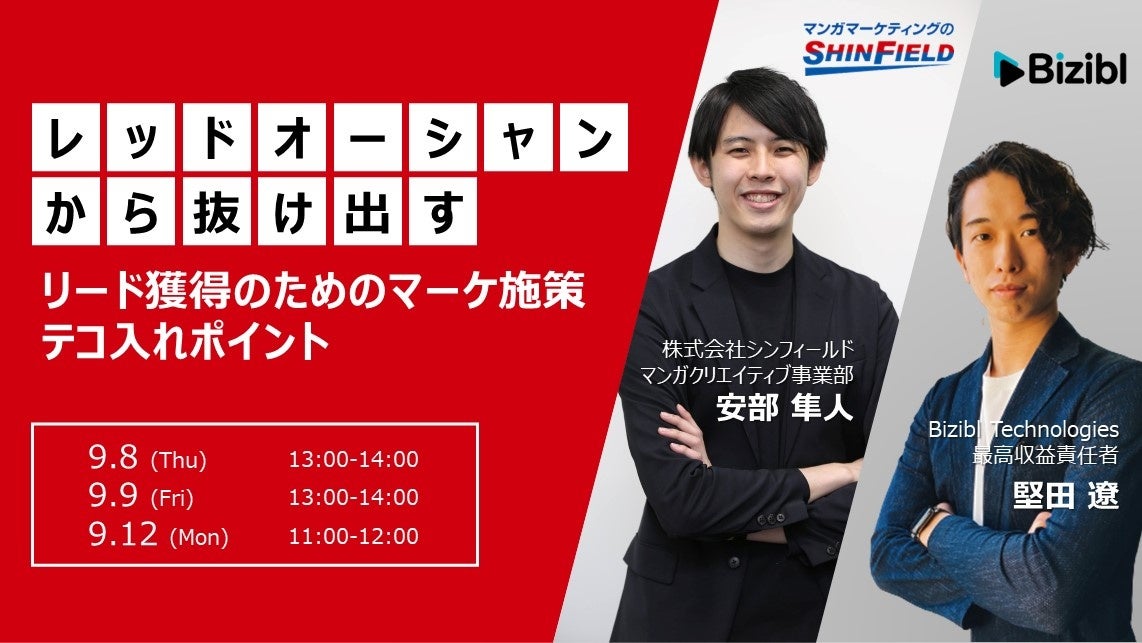 株式会社Bizibl Technologies(本社:大阪市北区、代表取締役:花谷燿平、以下Bizibl)と株式会社シンフィールド(本社:東京都千代田区、代表取締役:谷口晋也、以下シンフィールド)が 「【自社データ公開!】レッドオーシャンから抜け出す リード獲得のためのマーケ施策テコ入れポイント」 と題したウェビナーを9月8,9,12日に連日開催いたします。