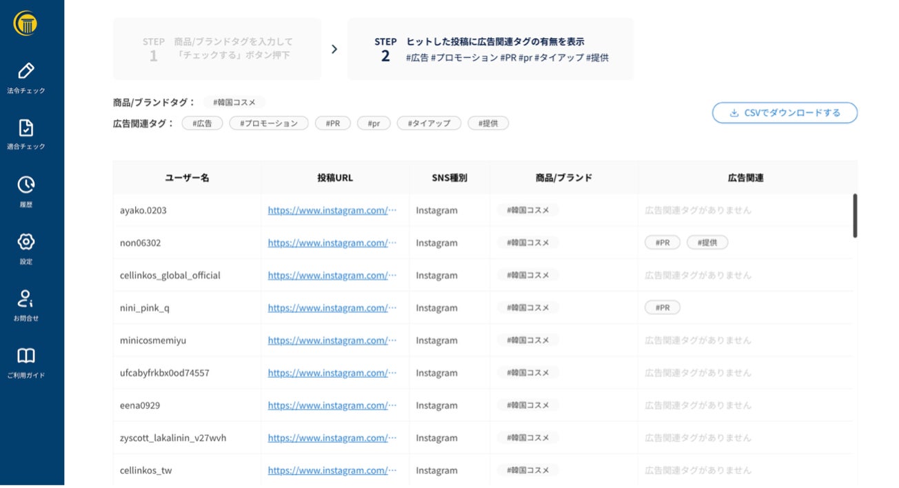 本機能は、X(旧Twitter)およびInstagram上の指定ハッシュタグ投稿をAIが自動収集・解析し、広告表記の有無を一元チェック。企業にとって喫緊の課題であるコンプライアンス対応とリスクマネジメントを支援するものです。