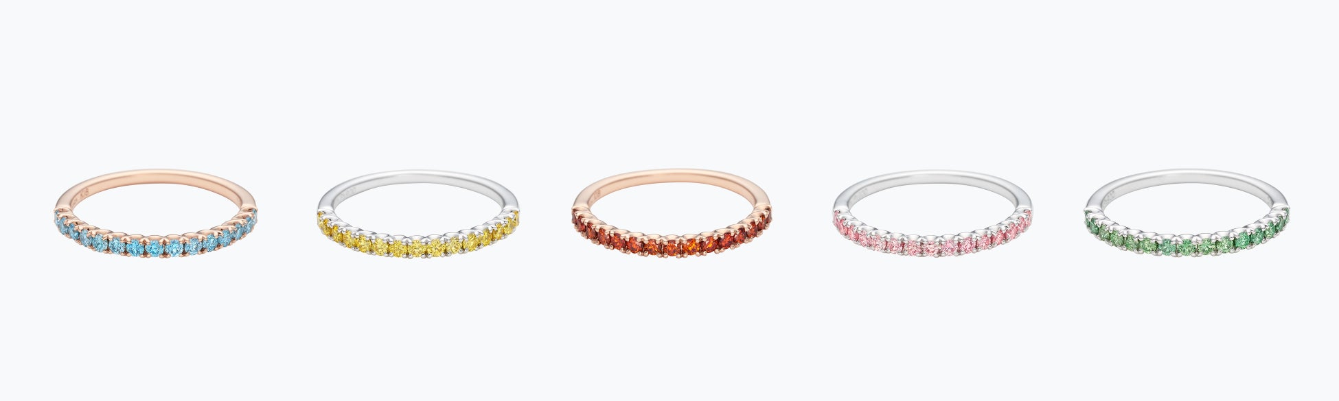 今回新たに登場するのは、計2デザイン、各5色(ピンク、ブルー、イエロー、オレンジ、グリーン)のカラーラボグロウンダイヤモンドです。今回の発売に先駆けて3月に伊勢丹 新宿店で行われたポップアップストアでも大変ご好評をいただいた新作アイテムが、ついに国内直営店舗と公式オンラインブティックでの販売をスタートいたします。カラーのみはもちろん、既存アイテムとのレイヤード等、自由なスタイリングでお楽しみください。