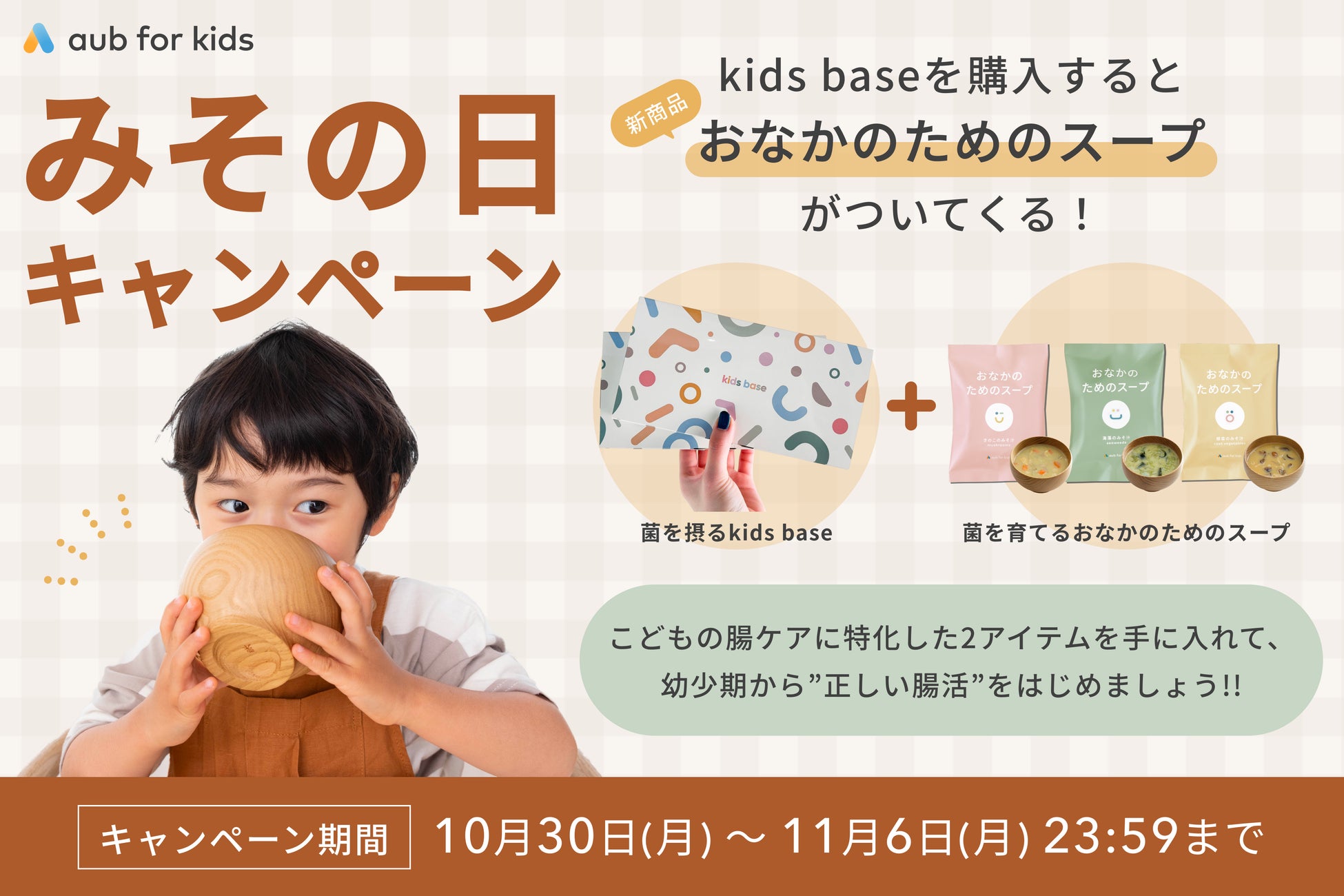 理想的な腸内環境を追求し、腸内細菌の研究をベースに腸ケア商品を開発・展開するAuB(オーブ)株式会社(本社:東京都中央区 代表取締役:鈴木 啓太)は、10月30日の「みその日」にちなみ、aub for kidsの粉末食品「kids base」を購入すると、新商品・こども向けフリーズドライみそ汁「おなかのためのスープ」が無料でついてくるキャンペーンを開催いたします。キャンペーン期間は、2023年10月30日(月)〜11月6日(月)までの1週間です。
