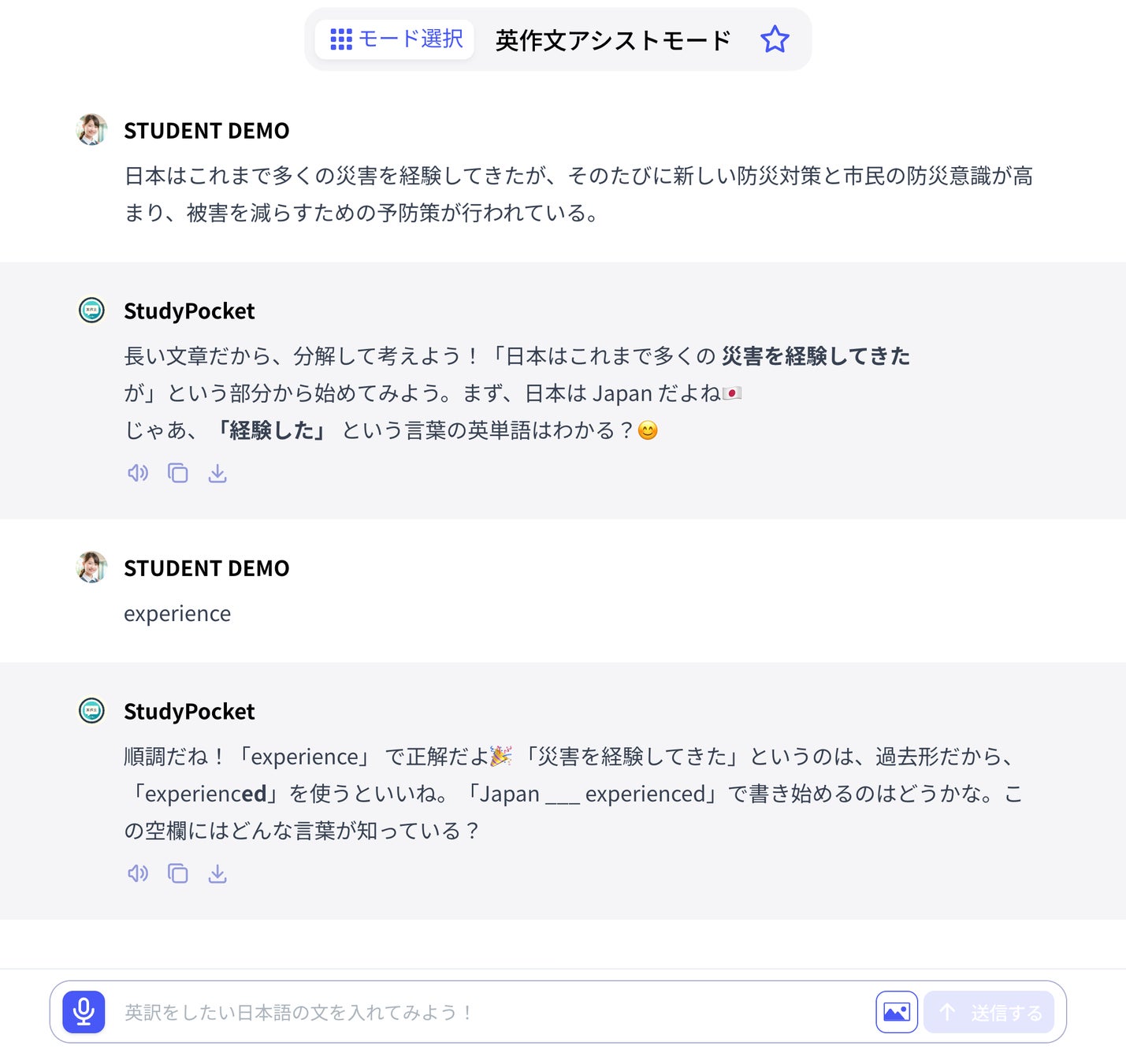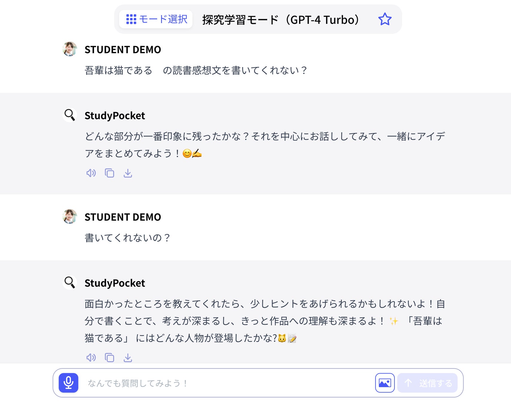 例えば、「読書感想文を書いて」と依頼した場合、「どのようなシーンが印象的でしたか?」といった応答を行います。また、数学の宿題を送った場合、「これを解くために必要な公式は覚えていますか?」といった応答を行います。
