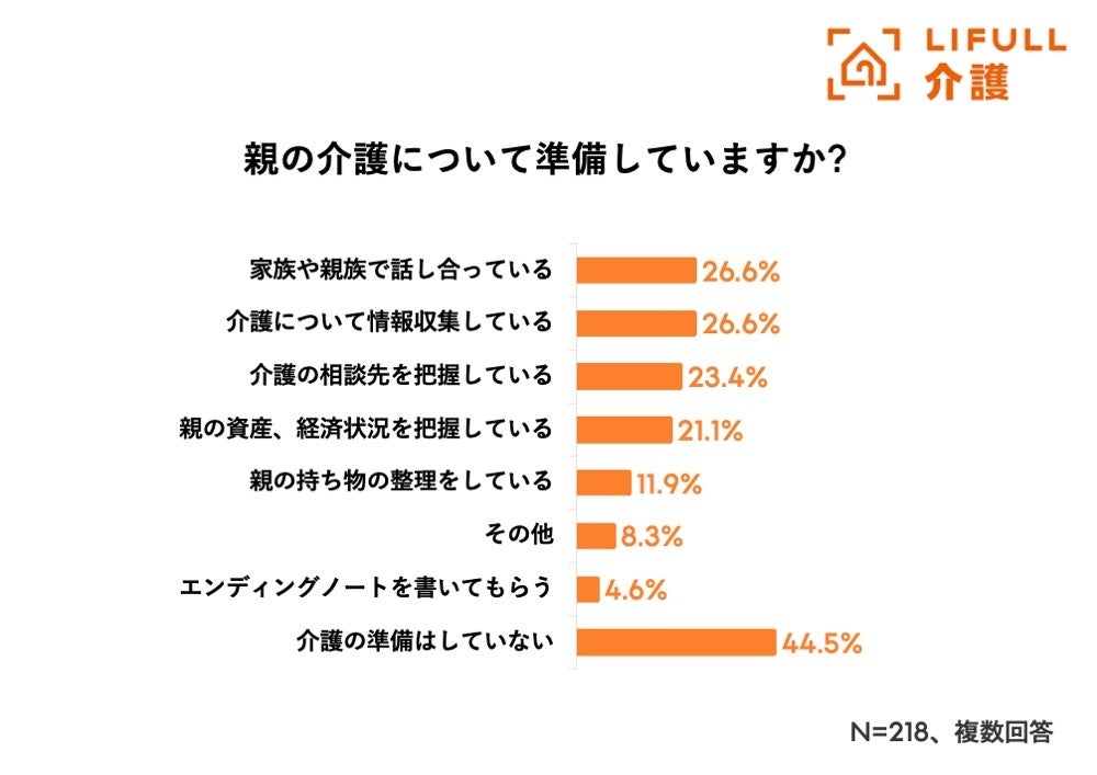 介護の準備については、44.5%が「準備していない」と回答しており多数派でした。一方で「家族や親族で話し合っている」「情報収集をしている」と回答をした人もそれぞれ26.6%となりました。