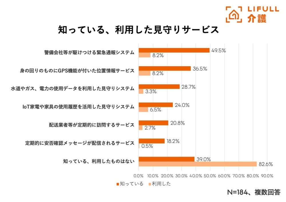 会う機会の少なさを代替できる、見守りサービスが昨今は充実しています。そこで見守りサービスについて知っているもの、利用したことがあるものを聞いてみました。