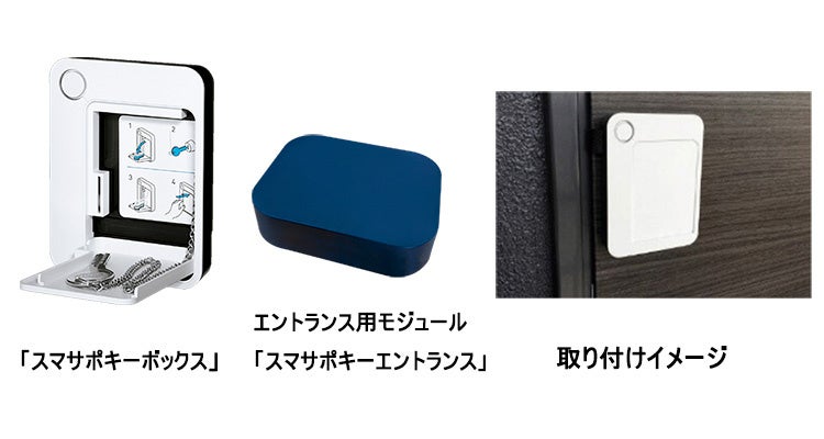 ボックス型のデバイスはエントランスドア部分に磁石を利用し取付け、専用の「スマサポキーアプリ」をインストールしたスマートフォンを利用することでボックスが開錠し、中から物理鍵が取り出せるという仕組みとなっています。集合住宅のエントランスオートロックにはスマサポキーボックスと連携するエントランス用モジュールを取り付けることで開錠に対応します。これらのデバイスを活用したスムーズな内覧と内覧履歴データの活用をお届けするサービスを総称「スマサポ内覧サービス」とし、展開しております。